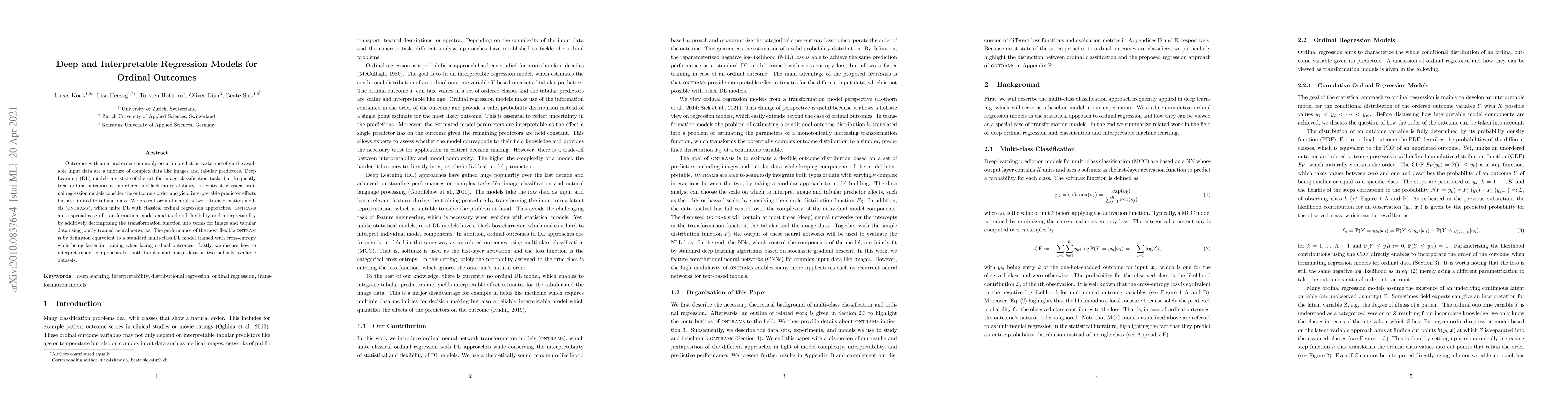 This paper introduces ordinal neural network transformation models (ONTRAMs) that combine the flexibility of deep learning with the interpretability of classical ordinal regression for ordered outcomes, using jointly trained neural networks to handle both image and tabular data. The proposed models achieve performance comparable to multi-class deep learning models while offering faster training and interpretability.
