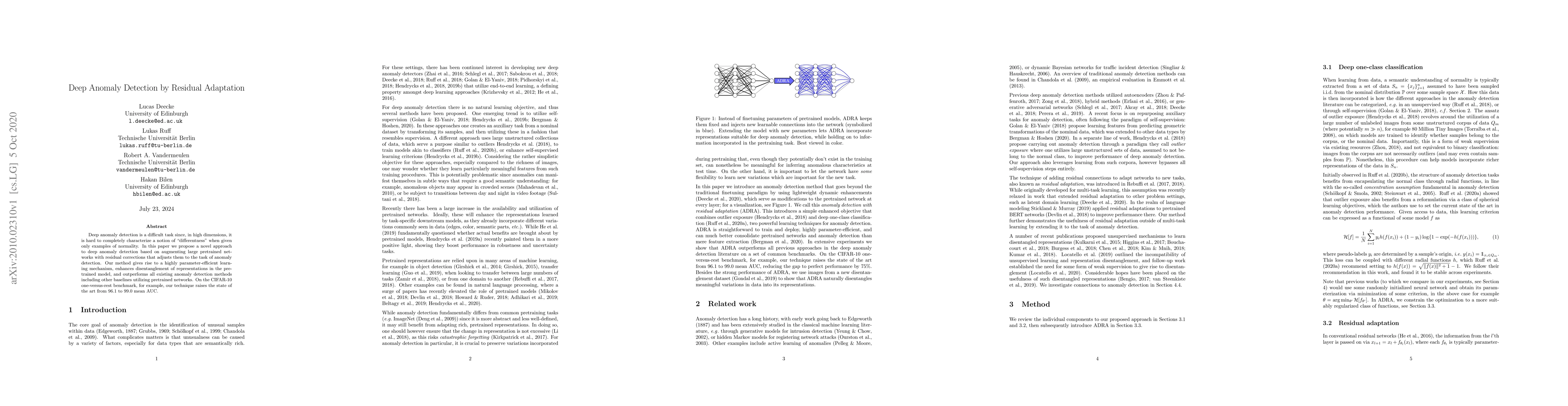 Deep anomaly detection is a difficult task since, in high dimensions, it is hard to completely characterize a notion of "differentness" when given only examples of normality. In this paper we propose a novel approach to deep anomaly detection based on augmenting large pretrained networks with residual corrections that adjusts them to the task of anomaly detection. Our method gives rise to a highly parameter-efficient learning mechanism, enhances disentanglement of representations in the pretrained model, and outperforms all existing anomaly detection methods including other baselines utilizing pretrained networks. On the CIFAR-10 one-versus-rest benchmark, for example, our technique raises the state of the art from 96.1 to 99.0 mean AUC.