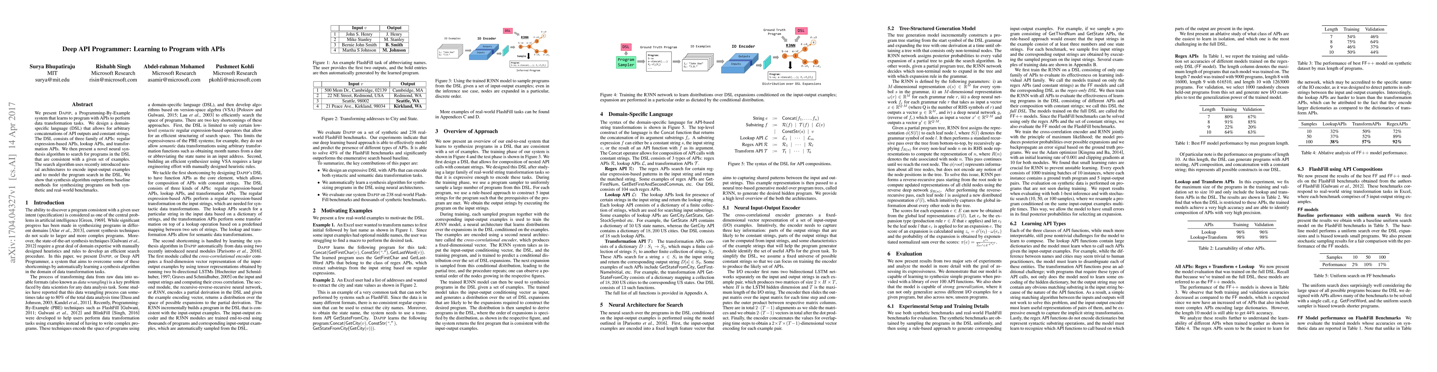 Researchers developed DAPIP, a system that learns to program with APIs for data transformation tasks using a novel neural synthesis algorithm that outperforms baseline methods on synthetic and real-world benchmarks.
