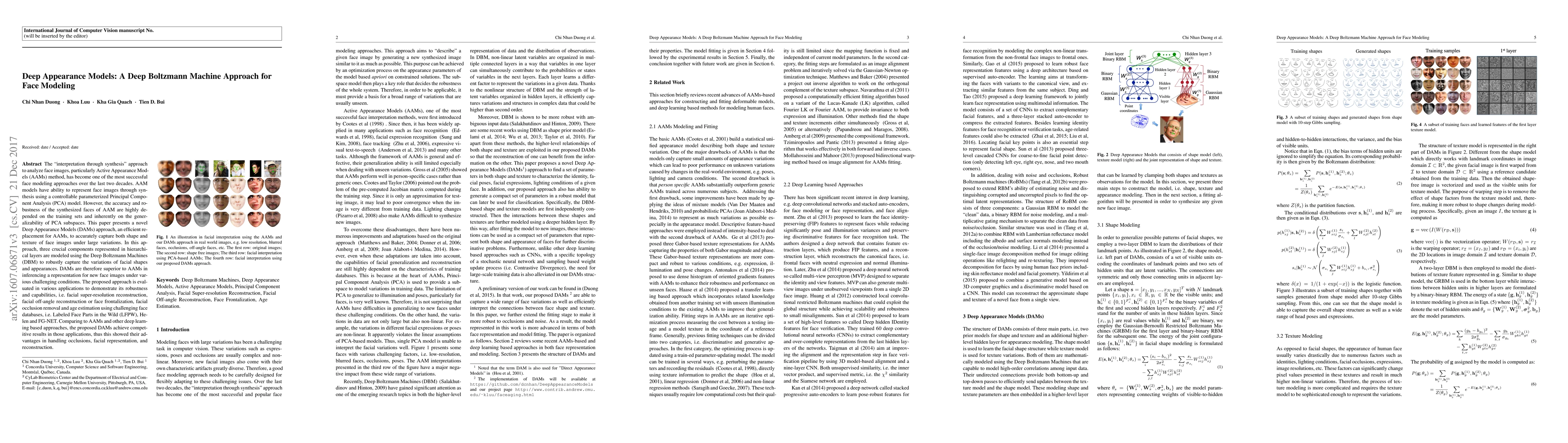 This paper introduces Deep Appearance Models (DAMs) using Deep Boltzmann Machines to replace Active Appearance Models (AAMs) for more accurate face representation and modeling under variations. DAMs outperform AAMs in applications like facial super-resolution and occlusion removal, demonstrating superior robustness and generalization.