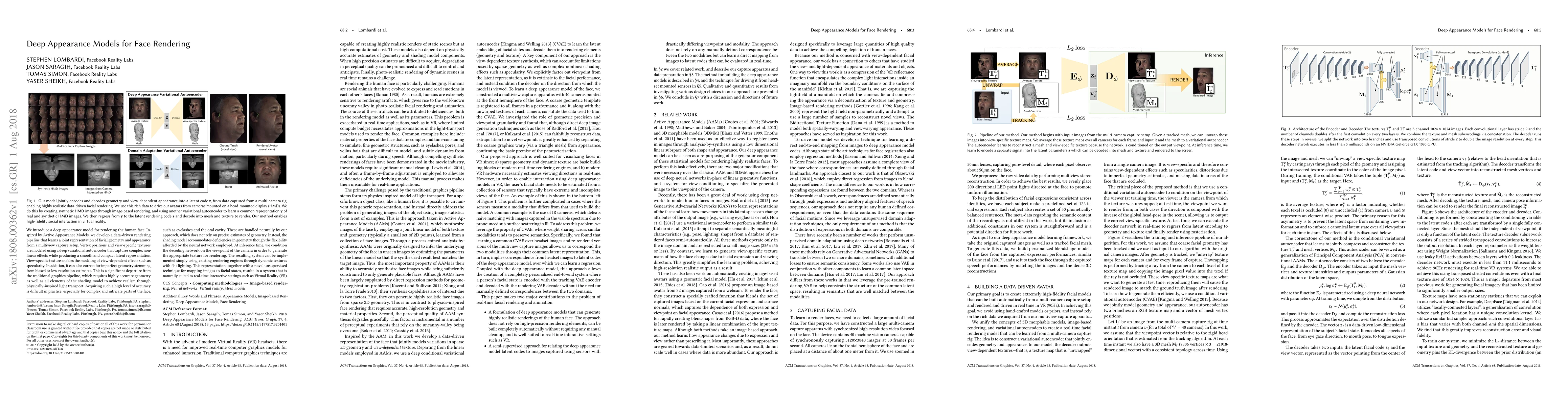 This paper introduces a deep appearance model for rendering human faces that learns to capture complex nonlinear effects and view-dependent textures without requiring precise geometry estimates, making it suitable for real-time interactive settings like VR.