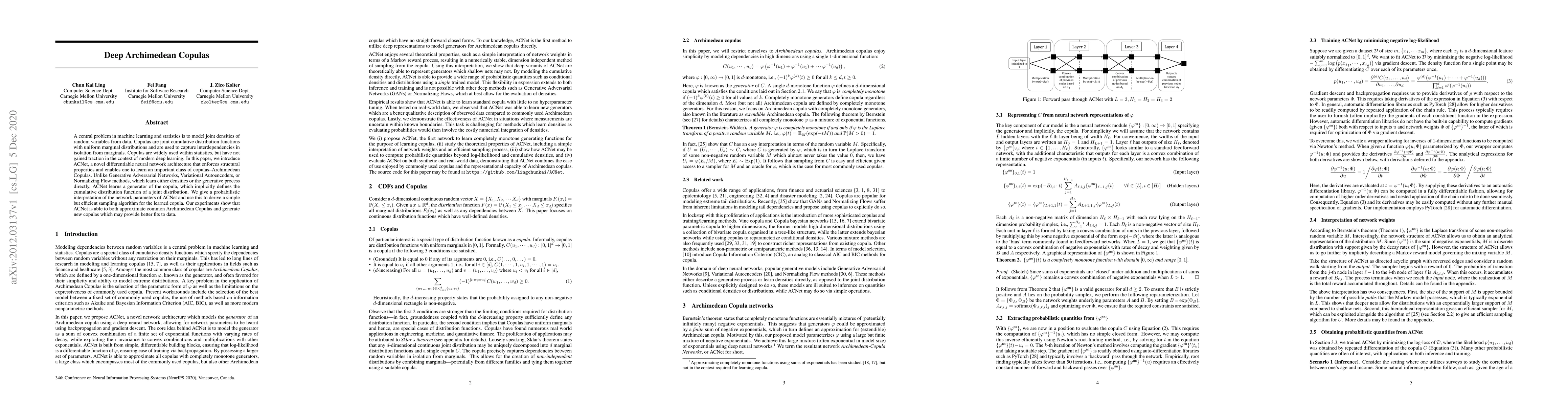 This paper introduces ACNet, a novel neural network architecture that learns Archimedean Copulas, enabling the modeling of joint densities by capturing interdependencies. Unlike other generative methods, ACNet learns a copula generator that implicitly defines the joint distribution's cumulative distribution function, offering a probabilistic interpretation and efficient sampling algorithm.