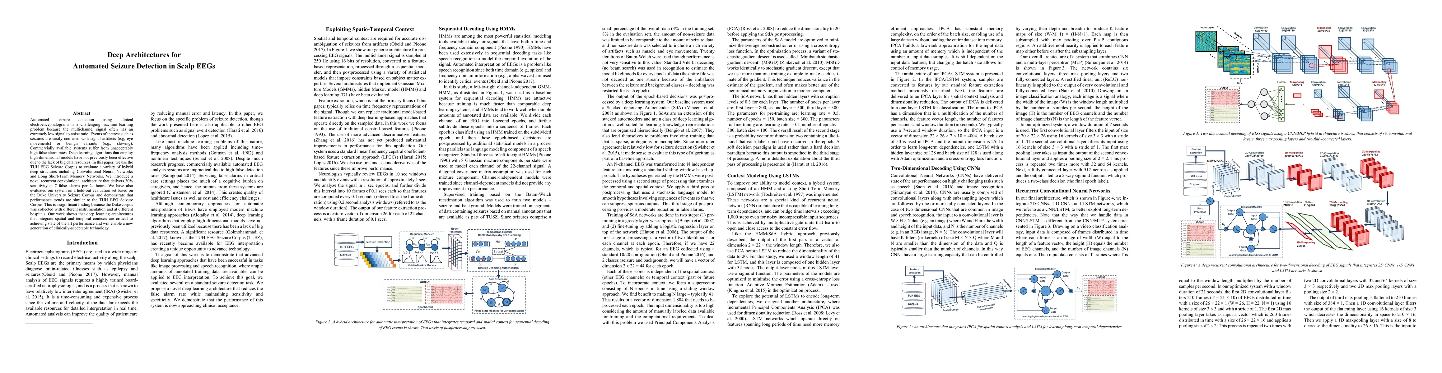 This paper proposes hybrid deep learning architectures, including convolutional and recurrent networks, for automated seizure detection in scalp EEGs, achieving 30% sensitivity with 7 false alarms per 24 hours. The novel recurrent convolutional model demonstrates robust performance across different datasets, indicating the importance of integrating spatial and temporal contexts for effective seizure detection.