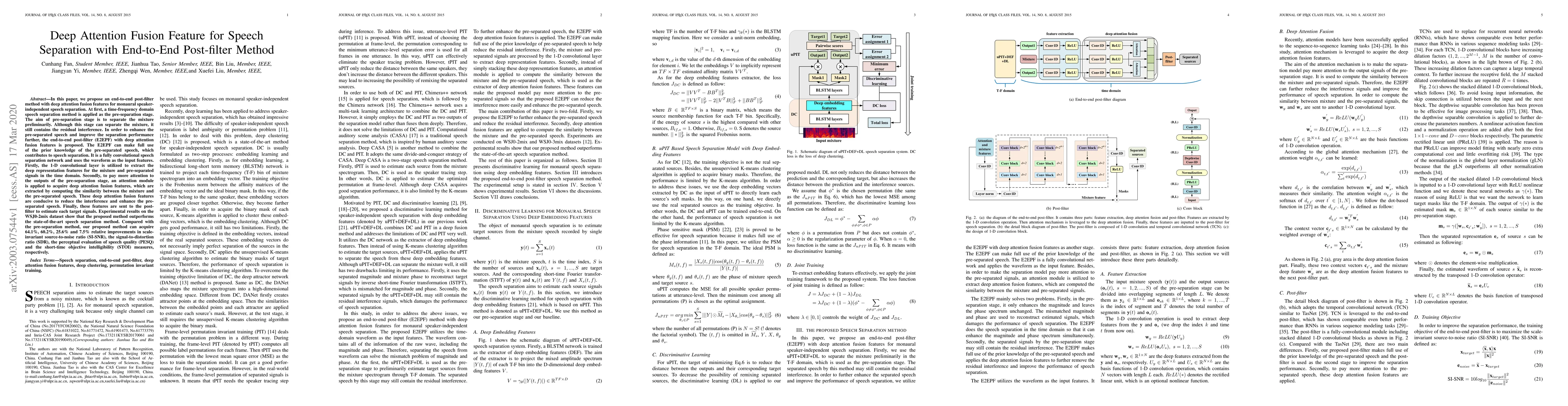 This paper proposes an end-to-end post-filter method with deep attention fusion features for monaural speech separation, achieving significant improvements over state-of-the-art methods. The method uses a pre-separation stage followed by an attention-based convolutional network to enhance the separated speech.