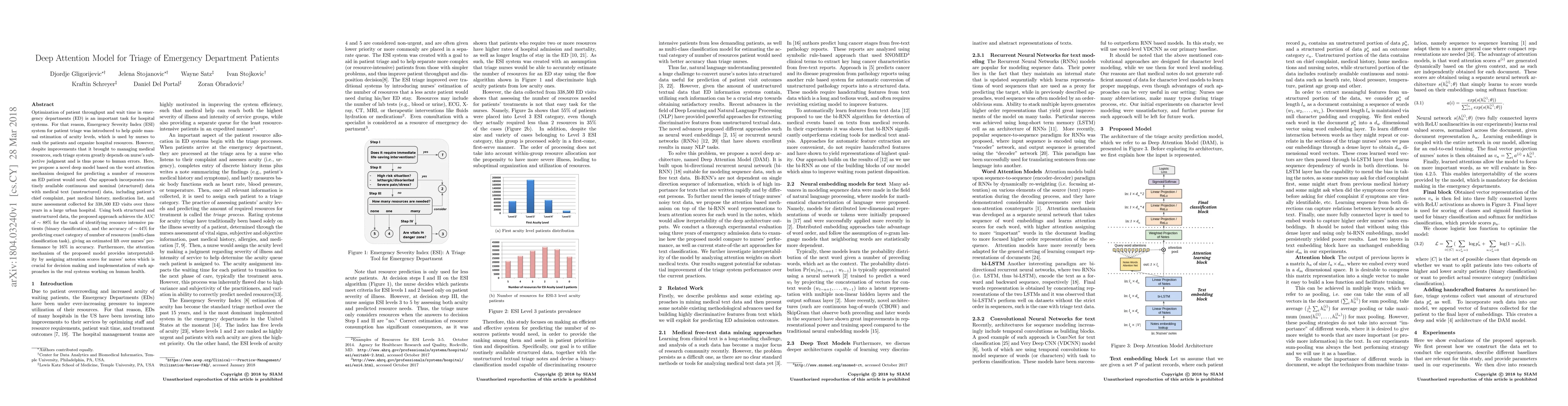 This paper proposes a deep attention model to optimize patient triage in emergency departments, combining structured and unstructured data to predict resource needs. The model achieves an AUC of ~88% for identifying high-resource patients and a 44% accuracy for predicting exact resource needs, outperforming nurses by 16% in accuracy, while providing interpretability through attention scores.
