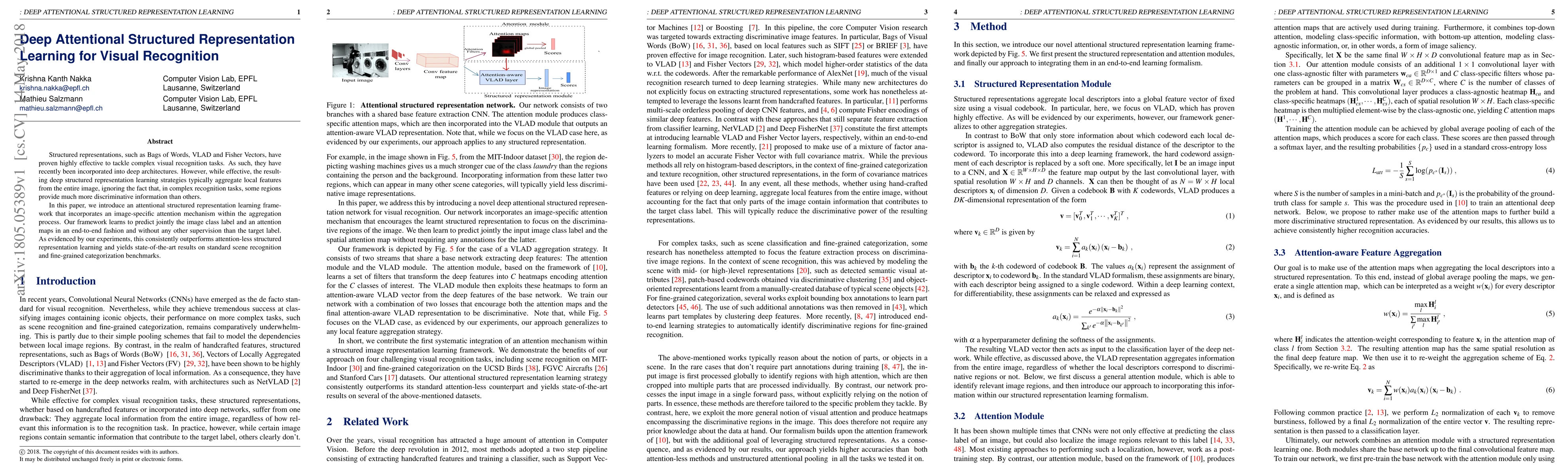 This paper proposes an attentional structured representation learning framework that uses an image-specific attention mechanism to aggregate discriminative features, outperforming traditional methods and achieving state-of-the-art results on scene recognition and fine-grained categorization tasks.