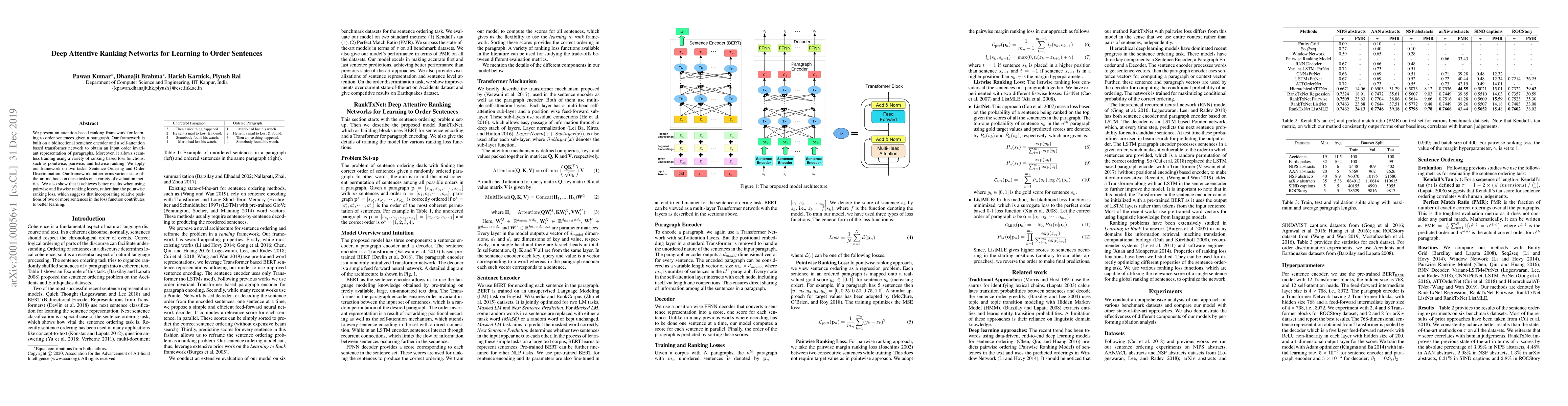 This paper proposes a deep attentive ranking network that uses bidirectional sentence encoding and self-attention to order sentences within a paragraph. The framework shows superior performance over state-of-the-art methods, especially when employing pairwise and listwise ranking losses, indicating that considering relative sentence positions enhances learning.