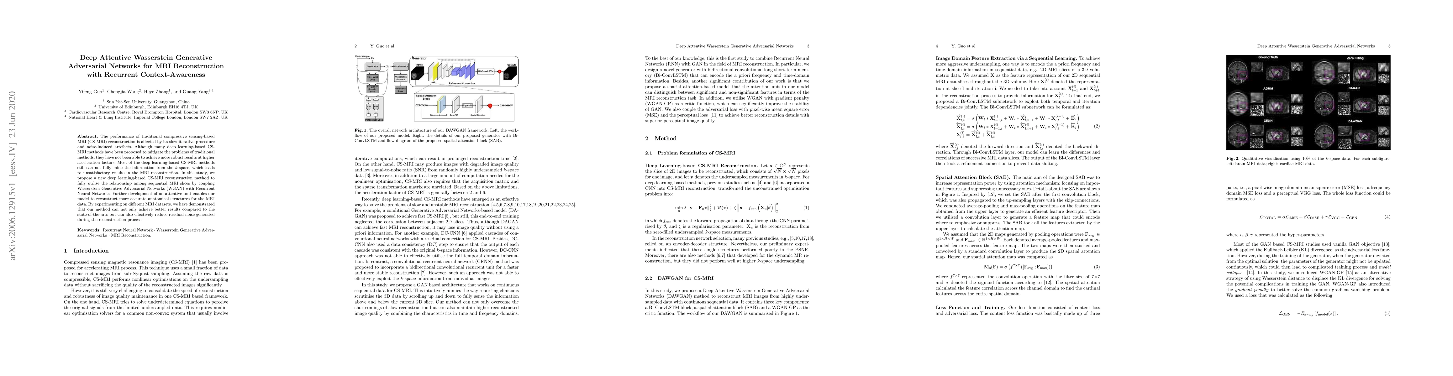 The performance of traditional compressive sensing-based MRI (CS-MRI) reconstruction is affected by its slow iterative procedure and noise-induced artefacts. Although many deep learning-based CS-MRI methods have been proposed to mitigate the problems of traditional methods, they have not been able to achieve more robust results at higher acceleration factors. Most of the deep learning-based CS-MRI methods still can not fully mine the information from the k-space, which leads to unsatisfactory results in the MRI reconstruction. In this study, we propose a new deep learning-based CS-MRI reconstruction method to fully utilise the relationship among sequential MRI slices by coupling Wasserstein Generative Adversarial Networks (WGAN) with Recurrent Neural Networks. Further development of an attentive unit enables our model to reconstruct more accurate anatomical structures for the MRI data. By experimenting on different MRI datasets, we have demonstrated that our method can not only achieve better results compared to the state-of-the-arts but can also effectively reduce residual noise generated during the reconstruction process.