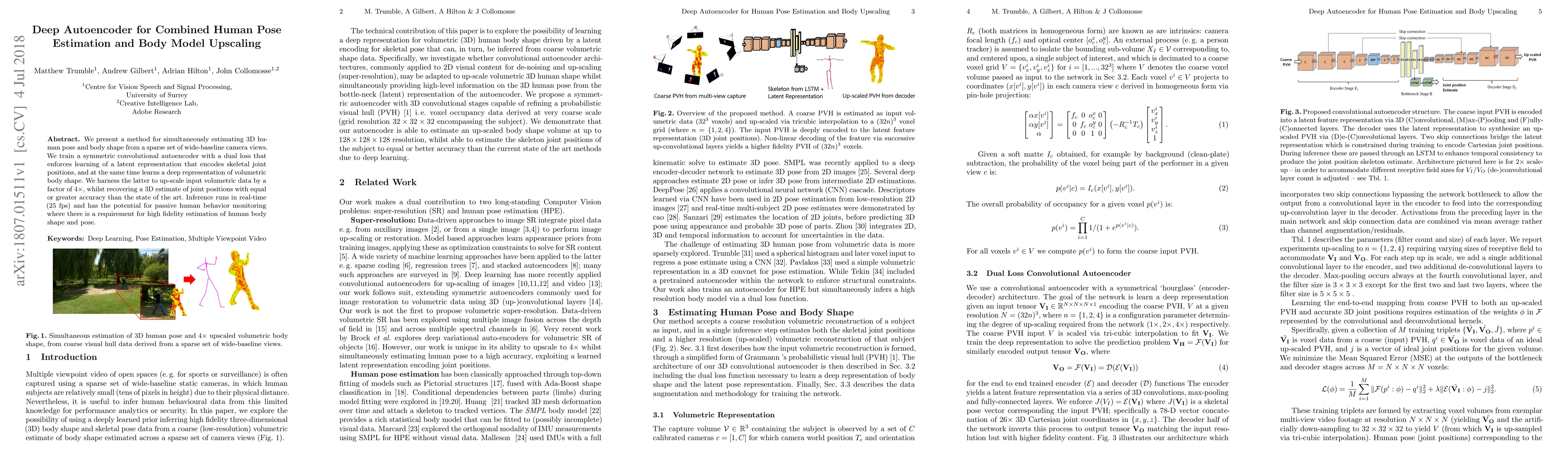 The paper presents a deep autoencoder for combined human pose estimation and body model upscaling from sparse wide-baseline camera views. It employs a symmetric convolutional autoencoder with a dual loss function, trained using Adadelta. The encoder is initially trained separately as a pose regression task before full dual-loss network training. LSTM layers are used to enforce temporal consistency in pose sequences.