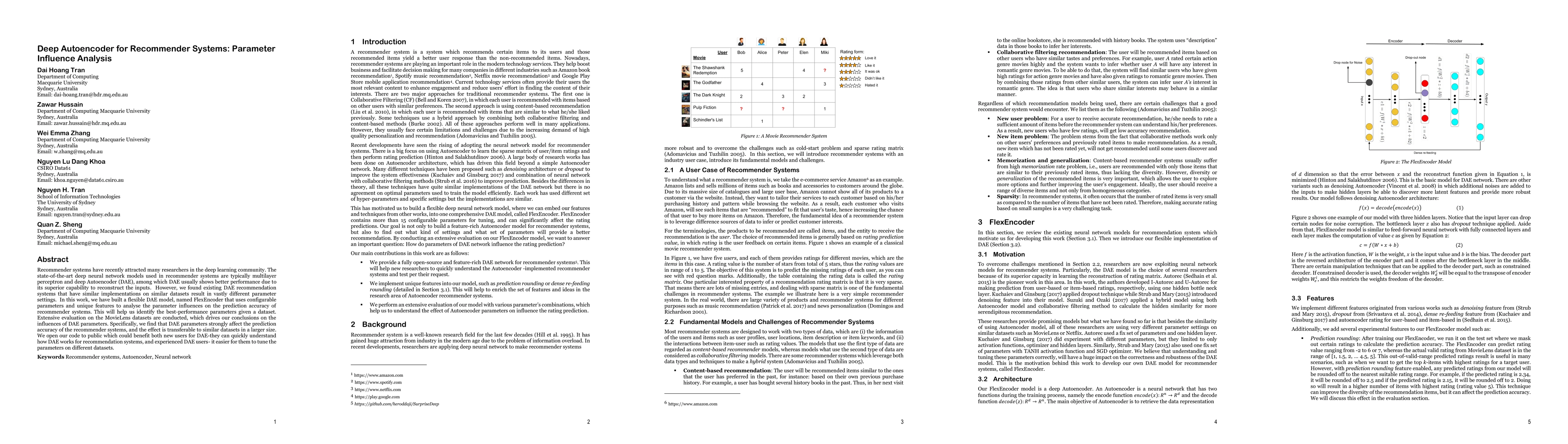 Recommender systems have recently attracted many researchers in the deep learning community. The state-of-the-art deep neural network models used in recommender systems are typically multilayer perceptron and deep Autoencoder (DAE), among which DAE usually shows better performance due to its superior capability to reconstruct the inputs. However, we found existing DAE recommendation systems that have similar implementations on similar datasets result in vastly different parameter settings. In this work, we have built a flexible DAE model, named FlexEncoder that uses configurable parameters and unique features to analyse the parameter influences on the prediction accuracy of recommender systems. This will help us identify the best-performance parameters given a dataset. Extensive evaluation on the MovieLens datasets are conducted, which drives our conclusions on the influences of DAE parameters. Specifically, we find that DAE parameters strongly affect the prediction accuracy of the recommender systems, and the effect is transferable to similar datasets in a larger size. We open our code to public which could benefit both new users for DAE -- they can quickly understand how DAE works for recommendation systems, and experienced DAE users -- it easier for them to tune the parameters on different datasets.