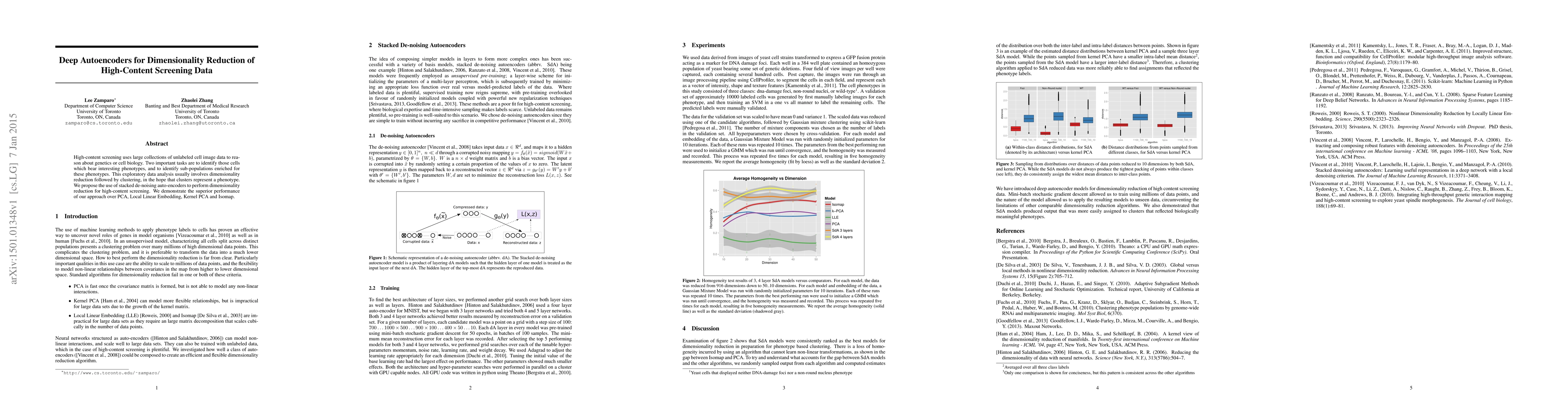 This paper proposes using stacked denoising autoencoders for dimensionality reduction in high-content screening of cell images, outperforming traditional methods like PCA, LLE, Kernel PCA, and Isomap. The approach aims to identify interesting phenotypes and sub-populations in large, unlabeled datasets.