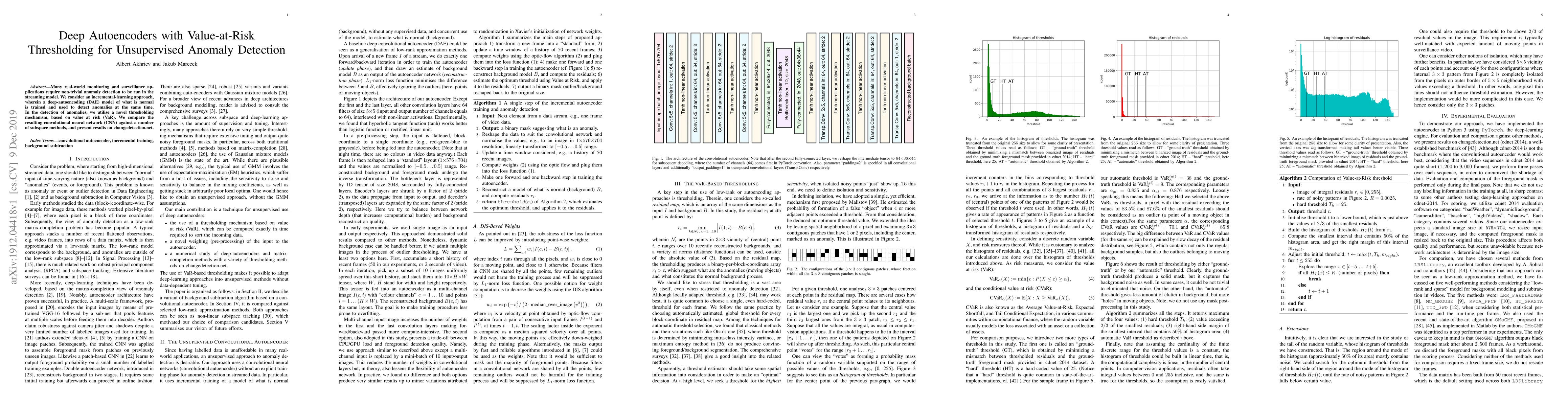 Many real-world monitoring and surveillance applications require non-trivial anomaly detection to be run in the streaming model. We consider an incremental-learning approach, wherein a deep-autoencoding (DAE) model of what is normal is trained and used to detect anomalies at the same time. In the detection of anomalies, we utilise a novel thresholding mechanism, based on value at risk (VaR). We compare the resulting convolutional neural network (CNN) against a number of subspace methods, and present results on changedetection net.