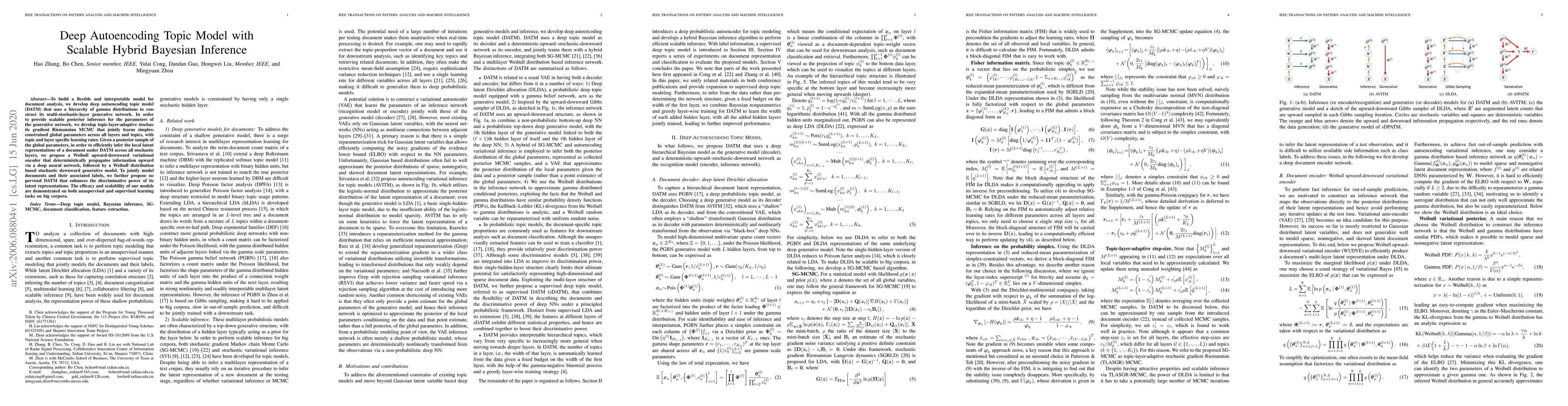 This paper introduces a deep autoencoding topic model (DATM) with scalable hybrid Bayesian inference, employing a hierarchical gamma distribution network and a novel stochastic gradient Riemannian MCMC for efficient posterior inference. The model also uses a Weibull upward-downward variational encoder for local latent representation inference and extends to supervised DATM for enhanced discriminative power.