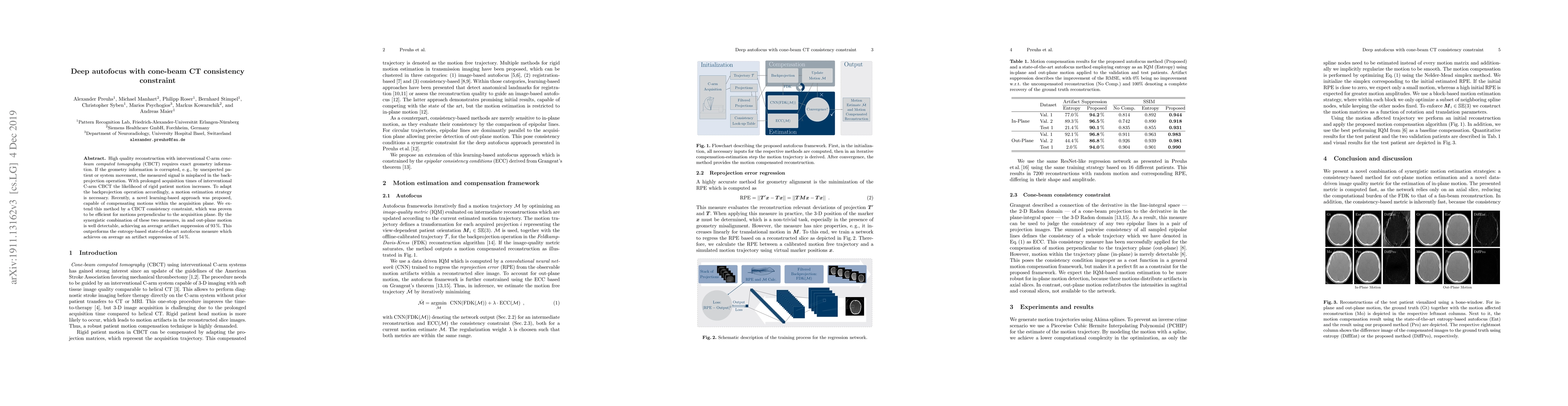 High quality reconstruction with interventional C-arm cone-beam computed tomography (CBCT) requires exact geometry information. If the geometry information is corrupted, e. g., by unexpected patient or system movement, the measured signal is misplaced in the backprojection operation. With prolonged acquisition times of interventional C-arm CBCT the likelihood of rigid patient motion increases. To adapt the backprojection operation accordingly, a motion estimation strategy is necessary. Recently, a novel learning-based approach was proposed, capable of compensating motions within the acquisition plane. We extend this method by a CBCT consistency constraint, which was proven to be efficient for motions perpendicular to the acquisition plane. By the synergistic combination of these two measures, in and out-plane motion is well detectable, achieving an average artifact suppression of 93 [percent]. This outperforms the entropy-based state-of-the-art autofocus measure which achieves on average an artifact suppression of 54 [percent].