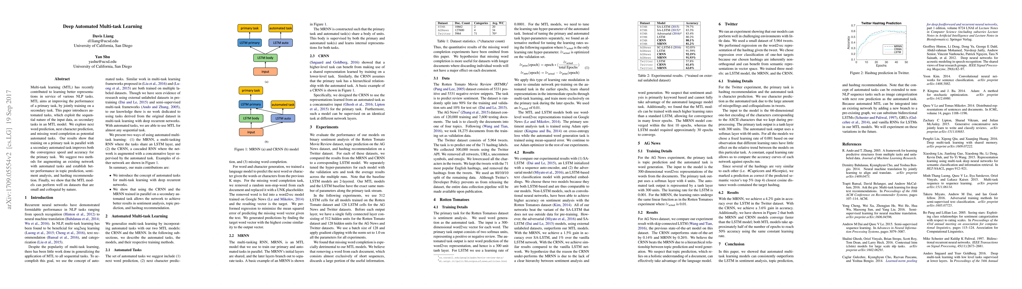 Multi-task learning (MTL) has recently contributed to learning better representations in service of various NLP tasks. MTL aims at improving the performance of a primary task, by jointly training on a secondary task. This paper introduces automated tasks, which exploit the sequential nature of the input data, as secondary tasks in an MTL model. We explore next word prediction, next character prediction, and missing word completion as potential automated tasks. Our results show that training on a primary task in parallel with a secondary automated task improves both the convergence speed and accuracy for the primary task. We suggest two methods for augmenting an existing network with automated tasks and establish better performance in topic prediction, sentiment analysis, and hashtag recommendation. Finally, we show that the MTL models can perform well on datasets that are small and colloquial by nature.