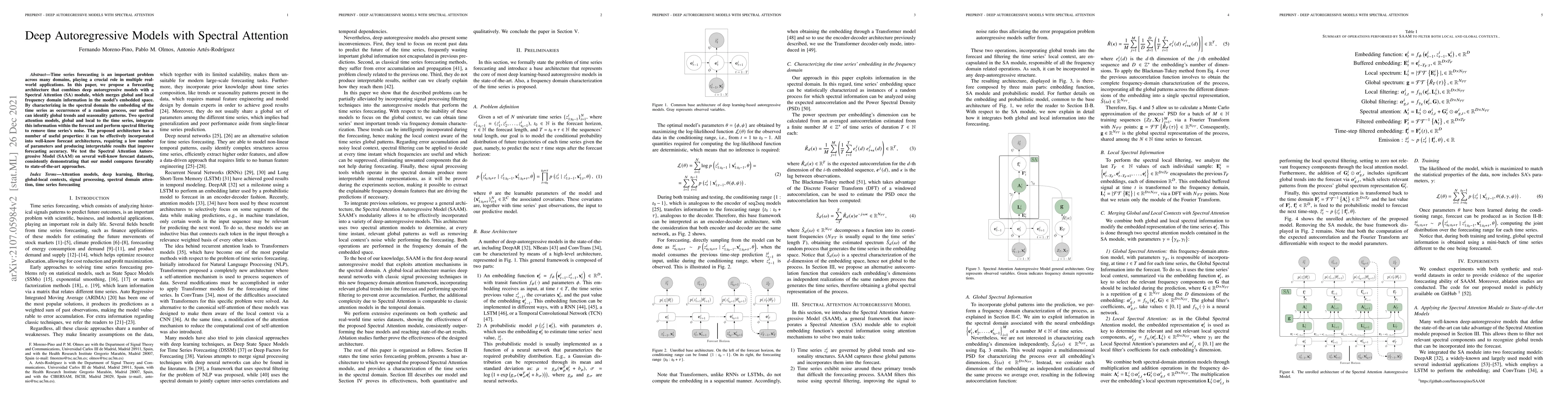 This paper proposes a new forecasting architecture combining deep autoregressive models with spectral attention, which improves time series forecasting accuracy by incorporating global and local frequency domain information. The model is found to perform favorably on several well-known datasets, offering interpretable results and low parameters.