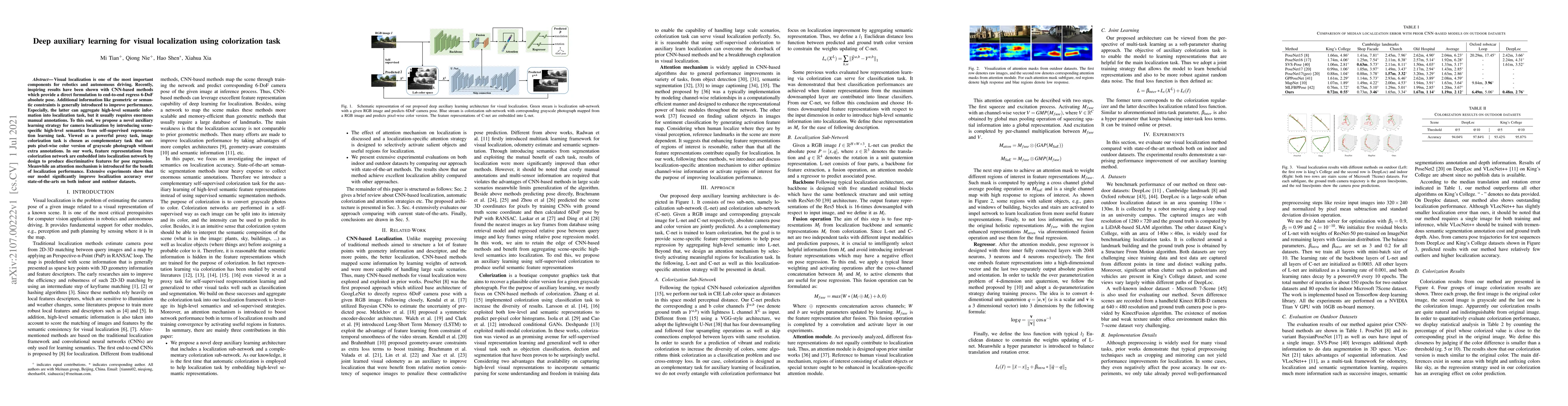 Visual localization is one of the most important components for robotics and autonomous driving. Recently, inspiring results have been shown with CNN-based methods which provide a direct formulation to end-to-end regress 6-DoF absolute pose. Additional information like geometric or semantic constraints is generally introduced to improve performance. Especially, the latter can aggregate high-level semantic information into localization task, but it usually requires enormous manual annotations. To this end, we propose a novel auxiliary learning strategy for camera localization by introducing scene-specific high-level semantics from self-supervised representation learning task. Viewed as a powerful proxy task, image colorization task is chosen as complementary task that outputs pixel-wise color version of grayscale photograph without extra annotations. In our work, feature representations from colorization network are embedded into localization network by design to produce discriminative features for pose regression. Meanwhile an attention mechanism is introduced for the benefit of localization performance. Extensive experiments show that our model significantly improve localization accuracy over state-of-the-arts on both indoor and outdoor datasets.
