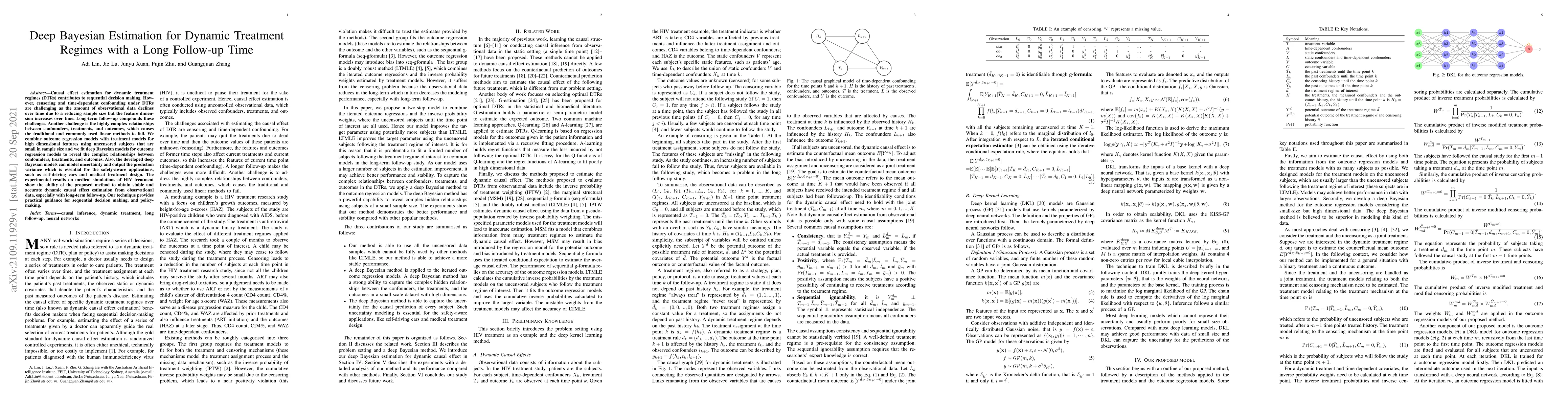 This paper proposes a deep Bayesian estimation method for dynamic treatment regimes, addressing challenges of censoring, time-dependent confounding, and high-dimensional features in long-term follow-up. The approach combines outcome regression models with treatment models and fits deep Bayesian models to capture complex relationships, providing stable and accurate causal effect estimation for sequential decision making.