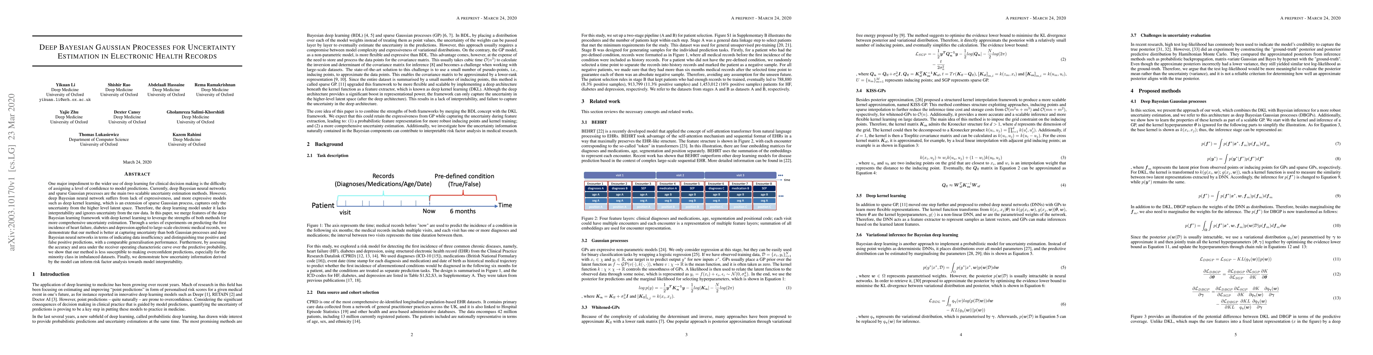 This paper proposes a hybrid deep Bayesian Gaussian process model to enhance uncertainty estimation in electronic health records. It combines the strengths of deep Bayesian networks with deep kernel learning to better capture uncertainty from both latent and raw data, demonstrating superior performance in predicting heart failure, diabetes, and depression compared to existing methods.