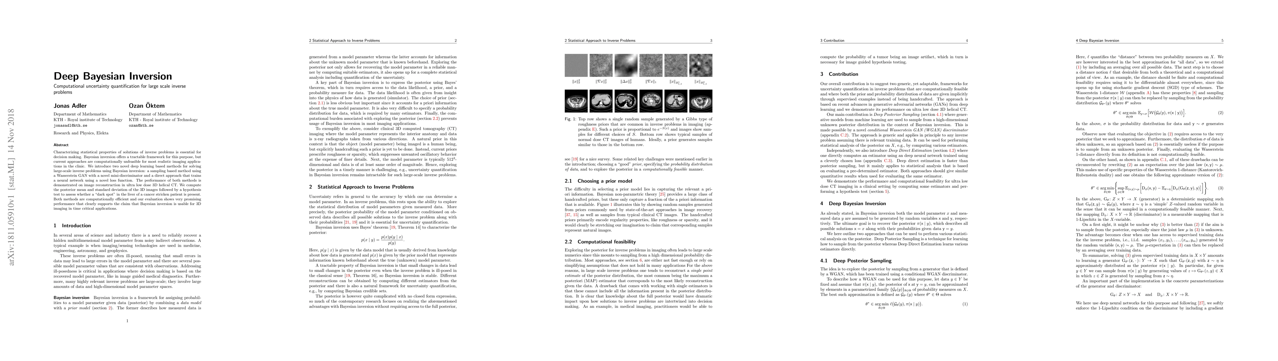 This paper introduces two deep learning methods for solving large-scale inverse problems using Bayesian inversion, demonstrating their efficiency and promising performance on ultra low dose 3D helical CT image reconstruction. The methods include a sampling-based approach and a direct neural network training method, both showing effective results in detecting "dark spots" in liver imaging.