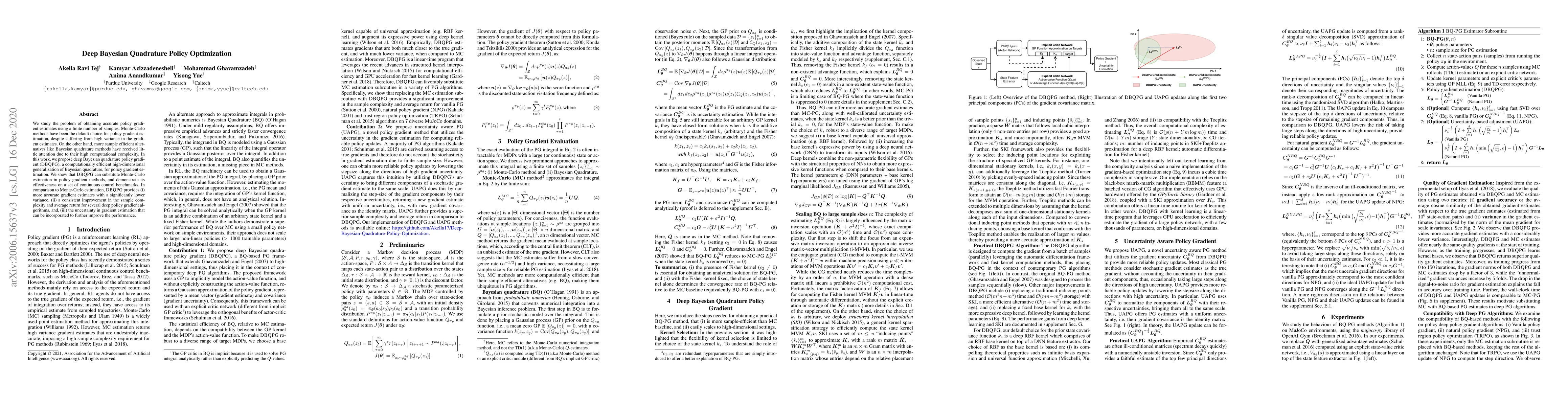 This paper proposes deep Bayesian quadrature policy gradient (DBQPG) to improve policy gradient estimation with fewer samples, offering more accurate and lower-variance gradient estimates compared to Monte-Carlo methods, and demonstrating consistent improvements in sample complexity and performance on continuous control tasks.