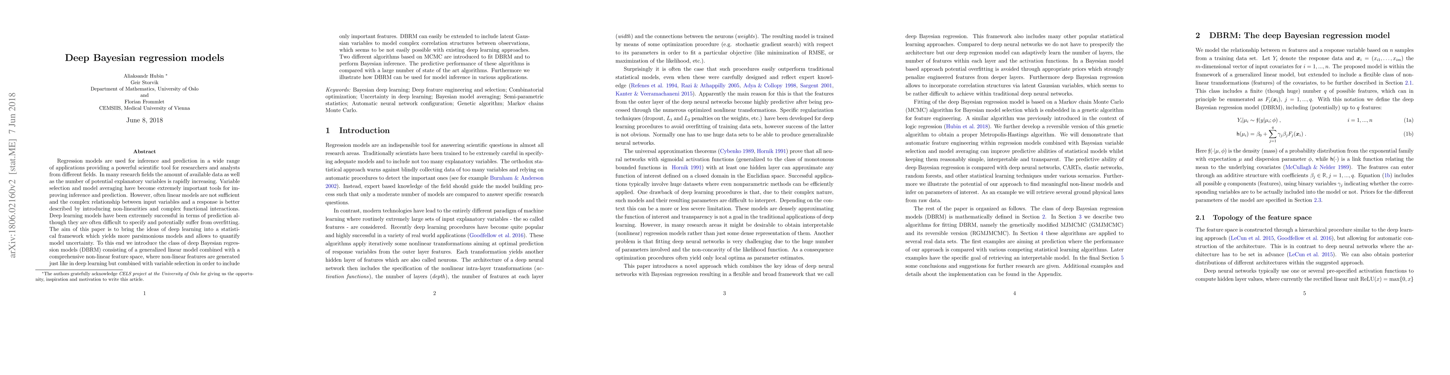 This paper introduces Deep Bayesian Regression Models (DBRM) that combine the non-linear feature generation of deep learning with Bayesian variable selection to create more parsimonious models and quantify uncertainty. The authors propose two MCMC-based algorithms for fitting DBRM and demonstrate its predictive performance and applicability across various applications.