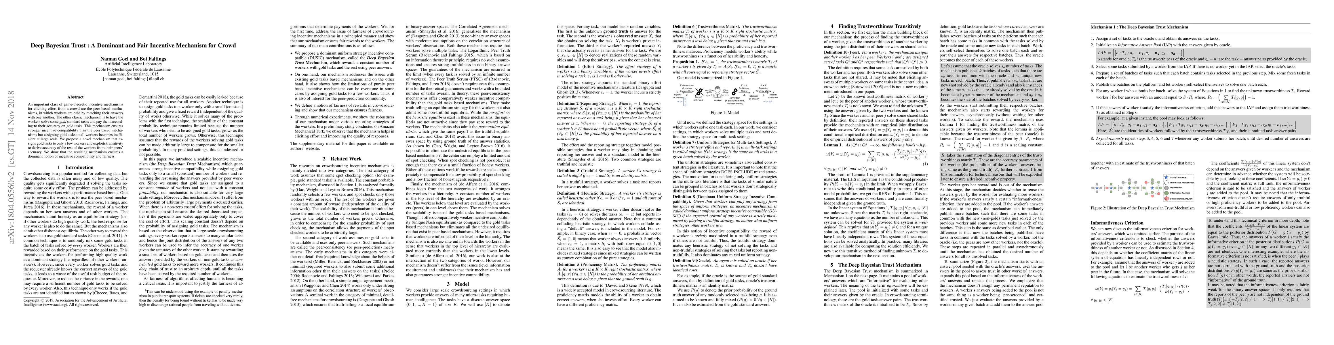 An important class of game-theoretic incentive mechanisms for eliciting effort from a crowd are the peer based mechanisms, in which workers are paid by matching their answers with one another. The other classic mechanism is to have the workers solve some gold standard tasks and pay them according to their accuracy on gold tasks. This mechanism ensures stronger incentive compatibility than the peer based mechanisms but assigning gold tasks to all workers becomes inefficient at large scale. We propose a novel mechanism that assigns gold tasks to only a few workers and exploits transitivity to derive accuracy of the rest of the workers from their peers' accuracy. We show that the resulting mechanism ensures a dominant notion of incentive compatibility and fairness.