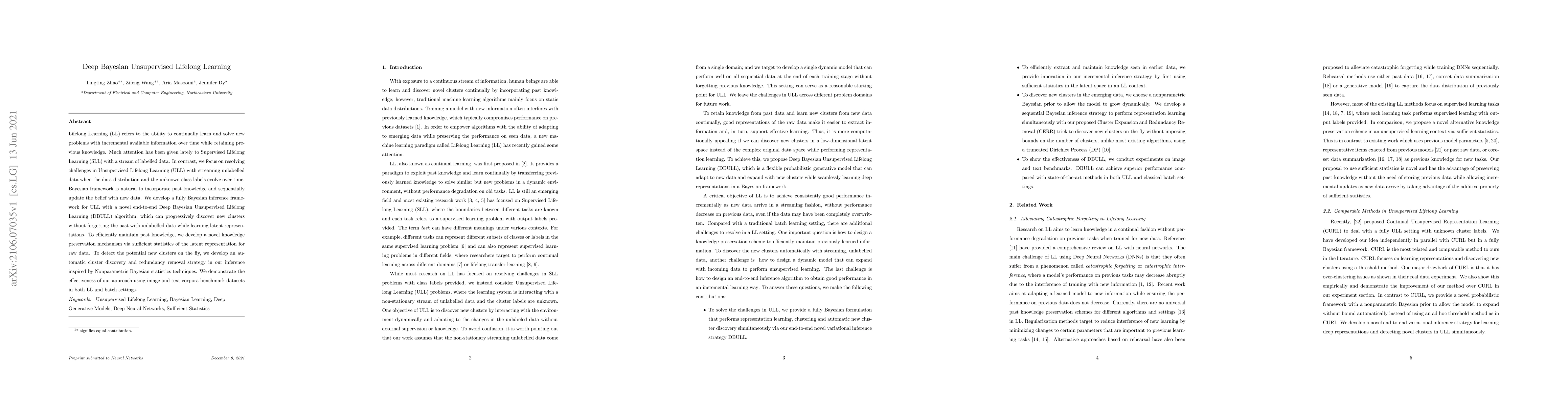 This paper introduces a Deep Bayesian Unsupervised Lifelong Learning (DBULL) algorithm that enables continuous learning from streaming unlabelled data while preserving past knowledge and detecting new clusters without forgetting previous information. The approach employs a Bayesian framework and novel knowledge preservation techniques for efficient learning and representation discovery.