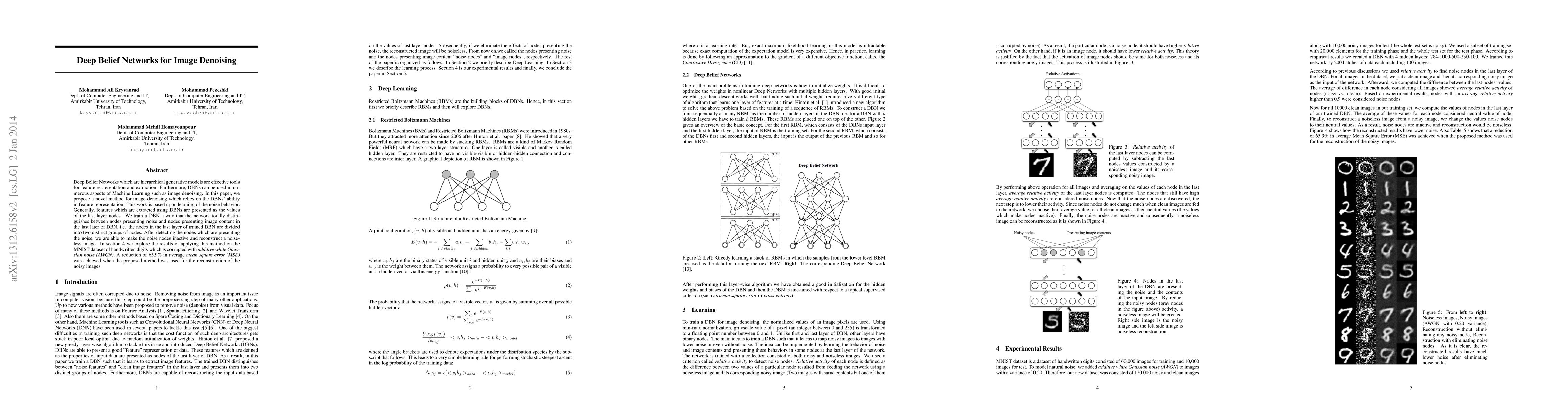 This paper proposes a novel method for image denoising using Deep Belief Networks (DBNs) that learns the noise behavior to distinguish between noise and image content. The method achieves a 65.9% reduction in average mean square error (MSE) on the MNIST dataset of handwritten digits corrupted with additive white Gaussian noise (AWGN).