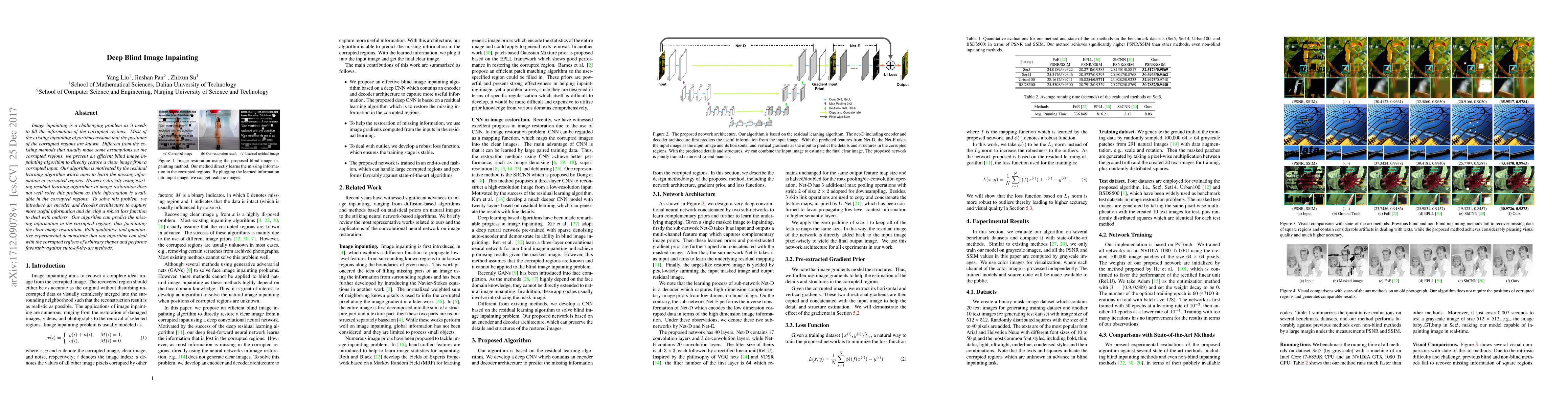 This paper presents an efficient blind image inpainting algorithm that restores clear images from corrupted inputs without prior knowledge of corrupted regions. The proposed encoder-decoder architecture and robust loss function enable the prediction of missing information, outperforming state-of-the-art methods in both qualitative and quantitative evaluations.