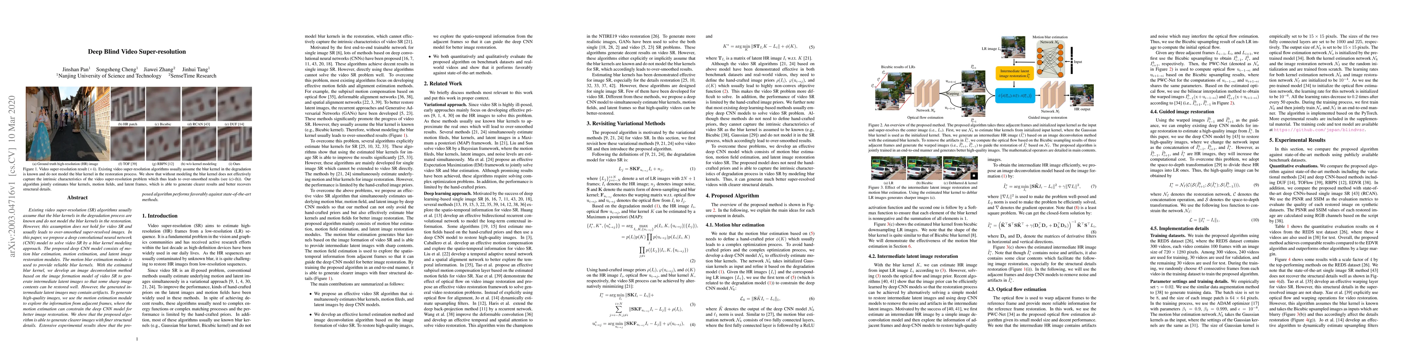 This paper proposes a deep convolutional neural network (CNN) model for blind video super-resolution (SR) that models motion blur kernels, improving image restoration by estimating blur kernels, generating intermediate latent images, and leveraging motion estimation from adjacent frames to enhance image quality and structural details. The method outperforms existing state-of-the-art techniques in experimental evaluations.