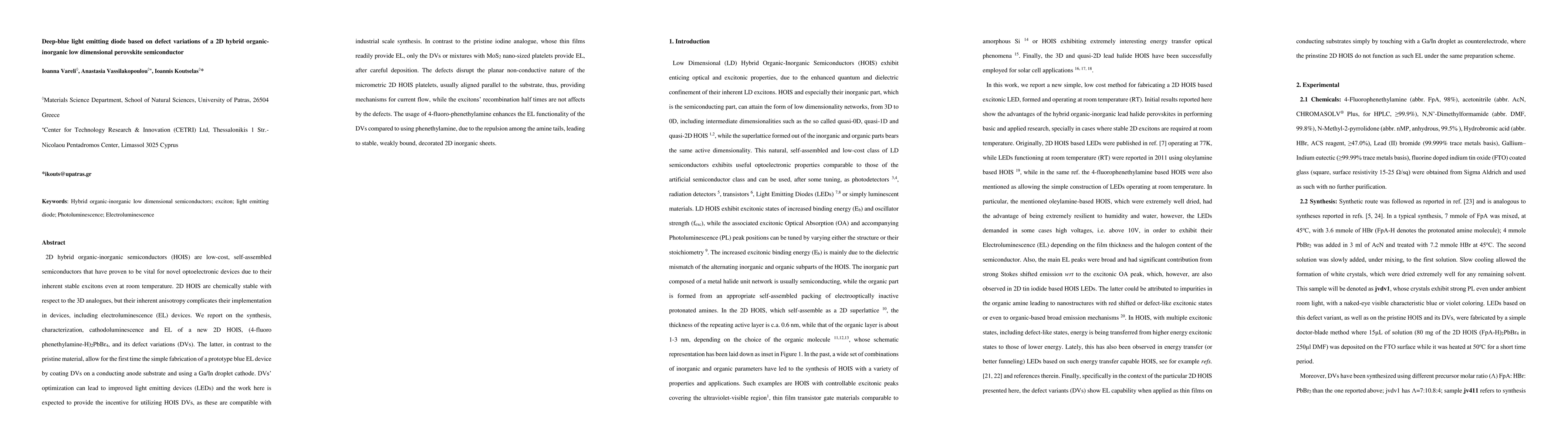 This paper details the synthesis and characterization of a new 2D hybrid organic-inorganic semiconductor (HOIS) with deep-blue light emission. Defect variations in the material, rather than the pristine form, enable the fabrication of a blue electroluminescent device, indicating potential for scalable, low-cost LEDs.