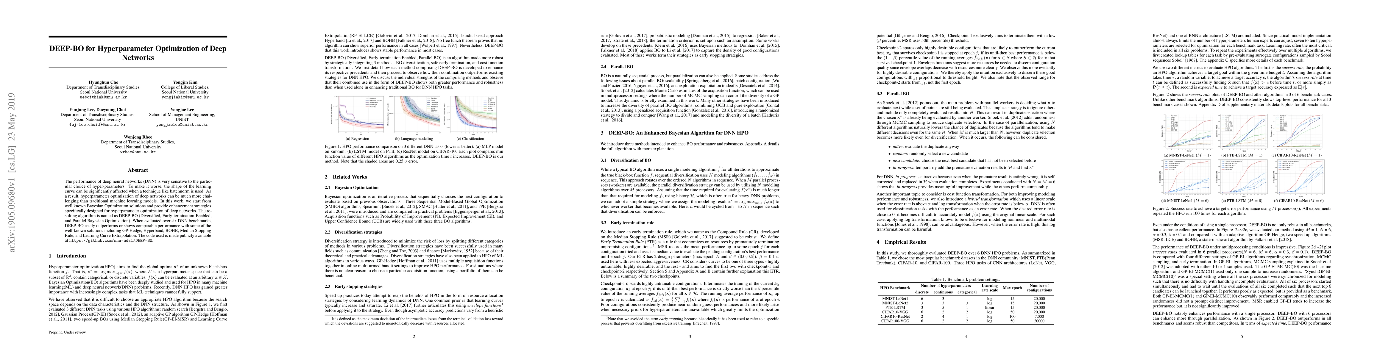 The performance of deep neural networks (DNN) is very sensitive to the particular choice of hyper-parameters. To make it worse, the shape of the learning curve can be significantly affected when a technique like batchnorm is used. As a result, hyperparameter optimization of deep networks can be much more challenging than traditional machine learning models. In this work, we start from well known Bayesian Optimization solutions and provide enhancement strategies specifically designed for hyperparameter optimization of deep networks. The resulting algorithm is named as DEEP-BO (Diversified, Early-termination-Enabled, and Parallel Bayesian Optimization). When evaluated over six DNN benchmarks, DEEP-BO easily outperforms or shows comparable performance with some of the well-known solutions including GP-Hedge, Hyperband, BOHB, Median Stopping Rule, and Learning Curve Extrapolation. The code used is made publicly available at https://github.com/snu-adsl/DEEP-BO.