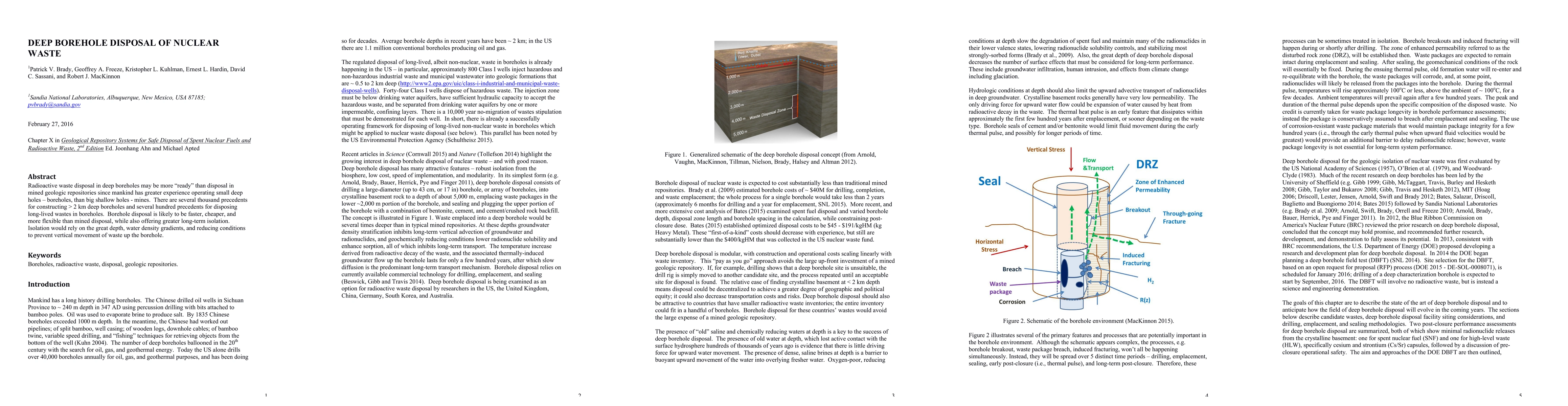 Radioactive waste disposal in deep boreholes may be more "ready" than disposal in mined geologic repositories since mankind has greater experience operating small deep holes - boreholes, than big shallow holes - mines. There are several thousand precedents for constructing >2 km deep boreholes and several hundred precedents for disposing long-lived wastes in boreholes. Borehole disposal is likely to be faster, cheaper, and more flexible than mined disposal, while also offering greater long-term isolation. Isolation would rely on the great depth, water density gradients, and reducing conditions to prevent vertical movement of waste up the borehole.