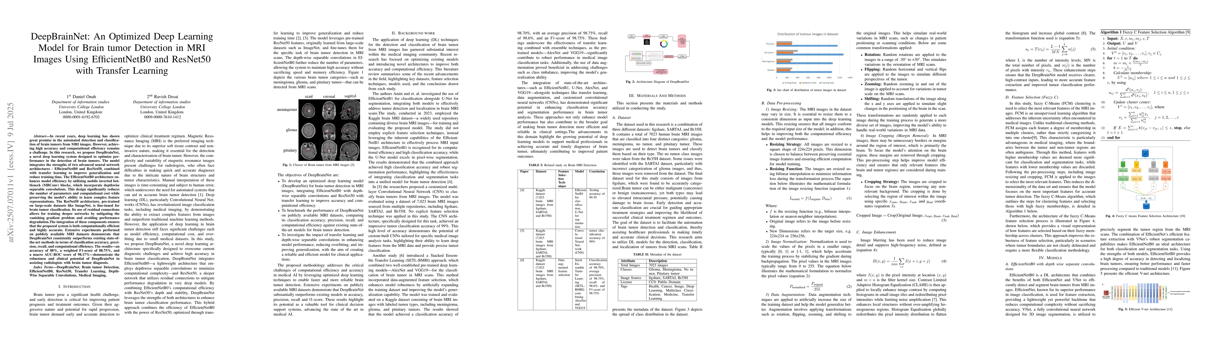 In recent years, deep learning has shown great promise in the automated detection and classification of brain tumors from MRI images. However, achieving high accuracy and computational efficiency remains a challenge. In this research, we propose Deep Brain Net, a novel deep learning system designed to optimize performance in the detection of brain tumors. The model integrates the strengths of two advanced neural network architectures which are EfficientNetB0 and ResNet50, combined with transfer learning to improve generalization and reduce training time. The EfficientNetB0 architecture enhances model efficiency by utilizing mobile inverted bottleneck blocks, which incorporate depth wise separable convolutions. This design significantly reduces the number of parameters and computational cost while preserving the ability of models to learn complex feature representations. The ResNet50 architecture, pre trained on large scale datasets like ImageNet, is fine tuned for brain tumor classification. Its use of residual connections allows for training deeper networks by mitigating the vanishing gradient problem and avoiding performance degradation. The integration of these components ensures that the proposed system is both computationally efficient and highly accurate. Extensive experiments performed on publicly available MRI datasets demonstrate that Deep Brain Net consistently outperforms existing state of the art methods in terms of classification accuracy, precision, recall, and computational efficiency. The result is an accuracy of 88 percent, a weighted F1 score of 88.75 percent, and a macro AUC ROC score of 98.17 percent which demonstrates the robustness and clinical potential of Deep Brain Net in assisting radiologists with brain tumor diagnosis.
