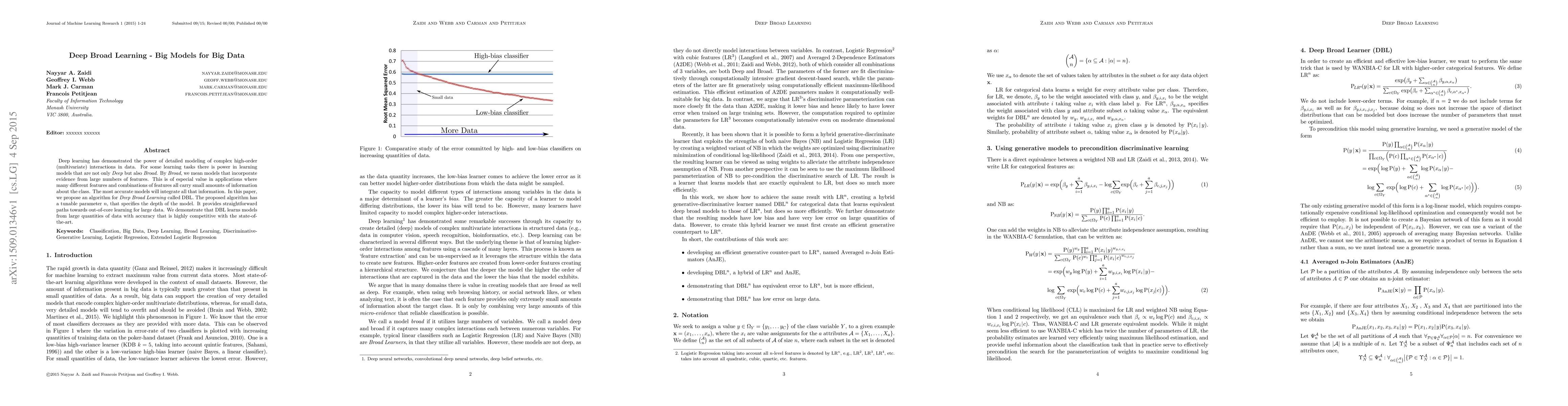 Deep learning has demonstrated the power of detailed modeling of complex high-order (multivariate) interactions in data. For some learning tasks there is power in learning models that are not only Deep but also Broad. By Broad, we mean models that incorporate evidence from large numbers of features. This is of especial value in applications where many different features and combinations of features all carry small amounts of information about the class. The most accurate models will integrate all that information. In this paper, we propose an algorithm for Deep Broad Learning called DBL. The proposed algorithm has a tunable parameter $n$, that specifies the depth of the model. It provides straightforward paths towards out-of-core learning for large data. We demonstrate that DBL learns models from large quantities of data with accuracy that is highly competitive with the state-of-the-art.