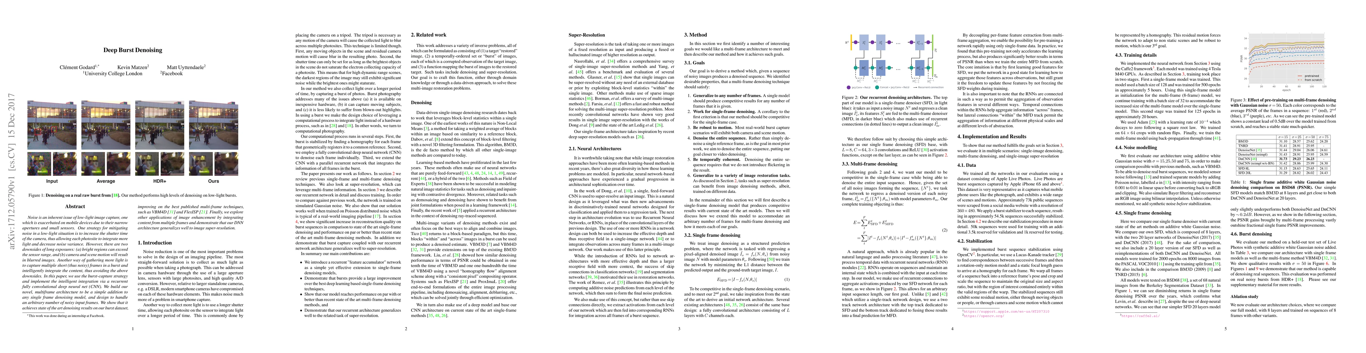 Noise is an inherent issue of low-light image capture, one which is exacerbated on mobile devices due to their narrow apertures and small sensors. One strategy for mitigating noise in a low-light situation is to increase the shutter time of the camera, thus allowing each photosite to integrate more light and decrease noise variance. However, there are two downsides of long exposures: (a) bright regions can exceed the sensor range, and (b) camera and scene motion will result in blurred images. Another way of gathering more light is to capture multiple short (thus noisy) frames in a "burst" and intelligently integrate the content, thus avoiding the above downsides. In this paper, we use the burst-capture strategy and implement the intelligent integration via a recurrent fully convolutional deep neural net (CNN). We build our novel, multiframe architecture to be a simple addition to any single frame denoising model, and design to handle an arbitrary number of noisy input frames. We show that it achieves state of the art denoising results on our burst dataset, improving on the best published multi-frame techniques, such as VBM4D and FlexISP. Finally, we explore other applications of image enhancement by integrating content from multiple frames and demonstrate that our DNN architecture generalizes well to image super-resolution.