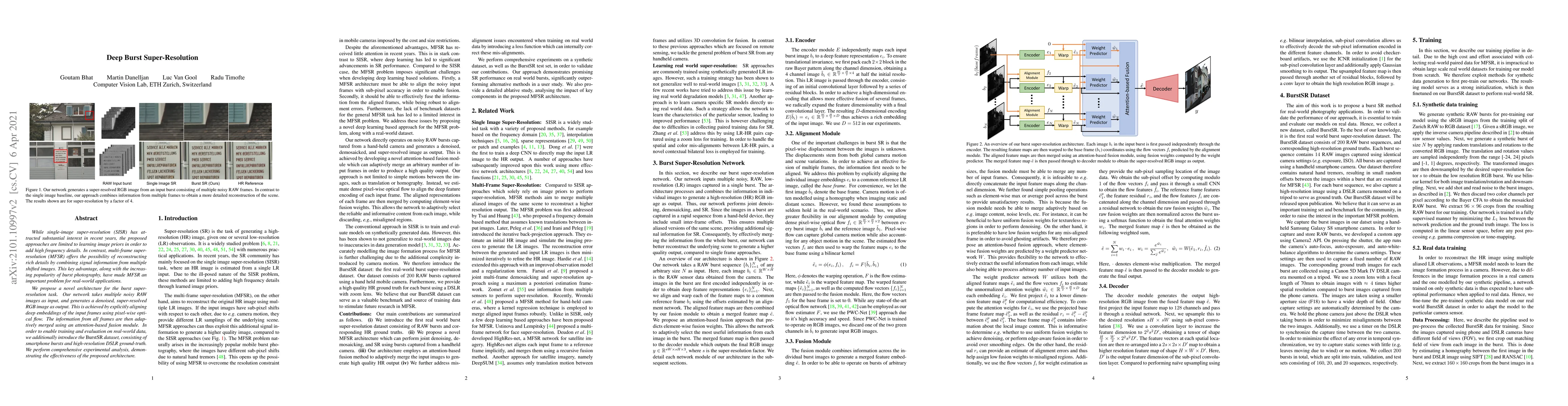 While single-image super-resolution (SISR) has attracted substantial interest in recent years, the proposed approaches are limited to learning image priors in order to add high frequency details. In contrast, multi-frame super-resolution (MFSR) offers the possibility of reconstructing rich details by combining signal information from multiple shifted images. This key advantage, along with the increasing popularity of burst photography, have made MFSR an important problem for real-world applications. We propose a novel architecture for the burst super-resolution task. Our network takes multiple noisy RAW images as input, and generates a denoised, super-resolved RGB image as output. This is achieved by explicitly aligning deep embeddings of the input frames using pixel-wise optical flow. The information from all frames are then adaptively merged using an attention-based fusion module. In order to enable training and evaluation on real-world data, we additionally introduce the BurstSR dataset, consisting of smartphone bursts and high-resolution DSLR ground-truth. We perform comprehensive experimental analysis, demonstrating the effectiveness of the proposed architecture.