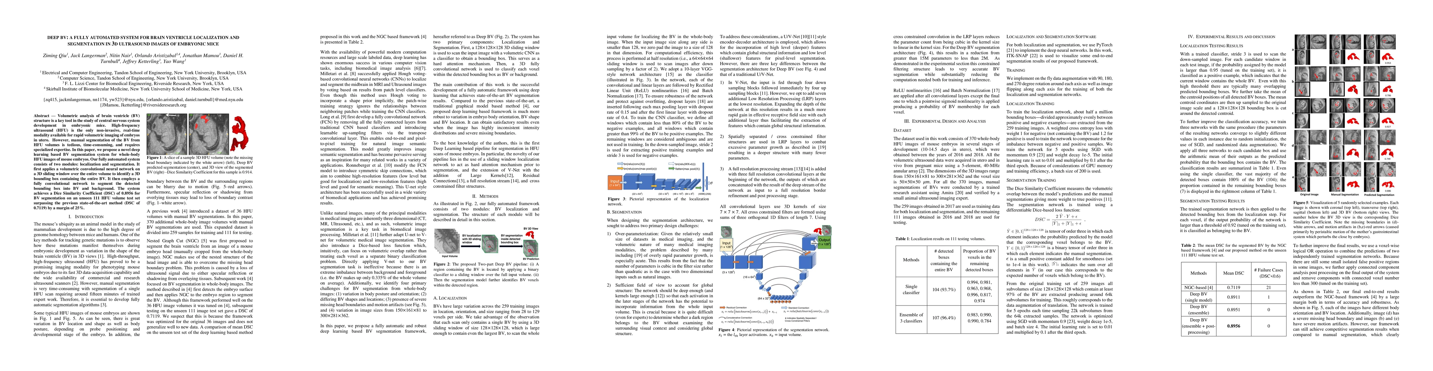 Volumetric analysis of brain ventricle (BV) structure is a key tool in the study of central nervous system development in embryonic mice. High-frequency ultrasound (HFU) is the only non-invasive, real-time modality available for rapid volumetric imaging of embryos in utero. However, manual segmentation of the BV from HFU volumes is tedious, time-consuming, and requires specialized expertise. In this paper, we propose a novel deep learning based BV segmentation system for whole-body HFU images of mouse embryos. Our fully automated system consists of two modules: localization and segmentation. It first applies a volumetric convolutional neural network on a 3D sliding window over the entire volume to identify a 3D bounding box containing the entire BV. It then employs a fully convolutional network to segment the detected bounding box into BV and background. The system achieves a Dice Similarity Coefficient (DSC) of 0.8956 for BV segmentation on an unseen 111 HFU volume test set surpassing the previous state-of-the-art method (DSC of 0.7119) by a margin of 25%.