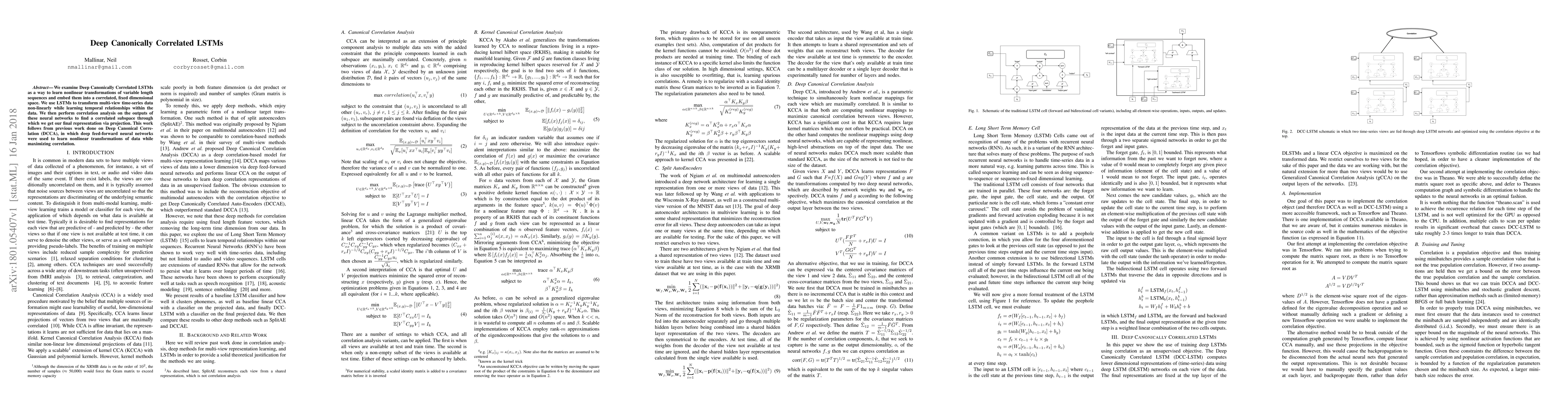 This paper explores Deep Canonically Correlated LSTMs to nonlinearly transform variable-length sequences and embed them into a correlated, fixed-dimensional space. The method leverages LSTMs for multi-view time-series data transformation and correlation analysis to derive a final representation.