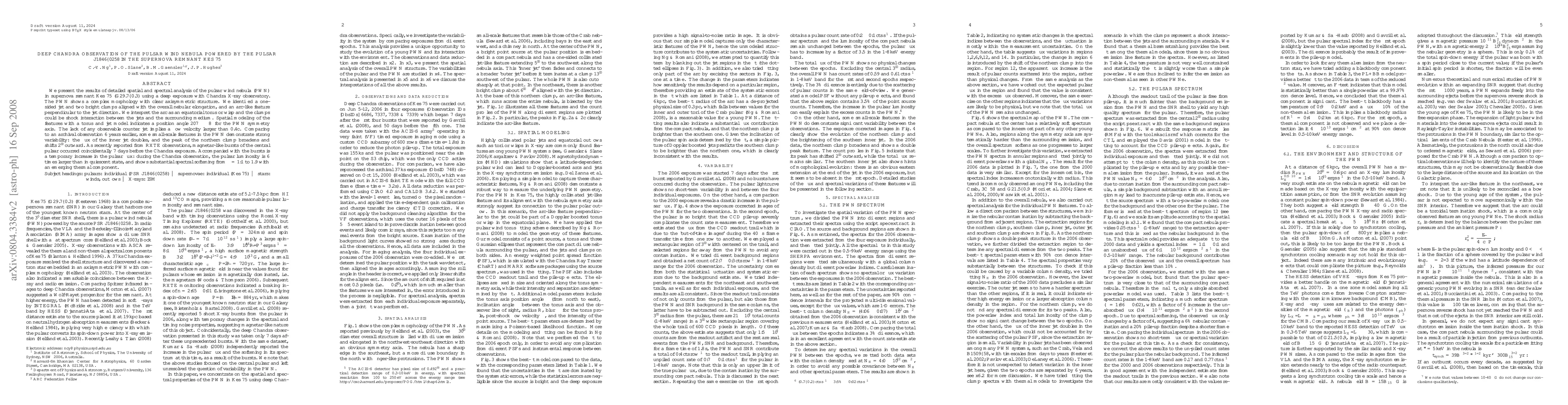 This paper reports on a detailed Chandra X-ray observation of the pulsar wind nebula (PWN) in the supernova remnant Kes 75, revealing a complex, axisymmetric morphology with a one-sided jet and bright clumps. The pulsar flux has increased significantly, showing spectral softening and an emerging thermal component, likely linked to recent magnetar-like bursts.