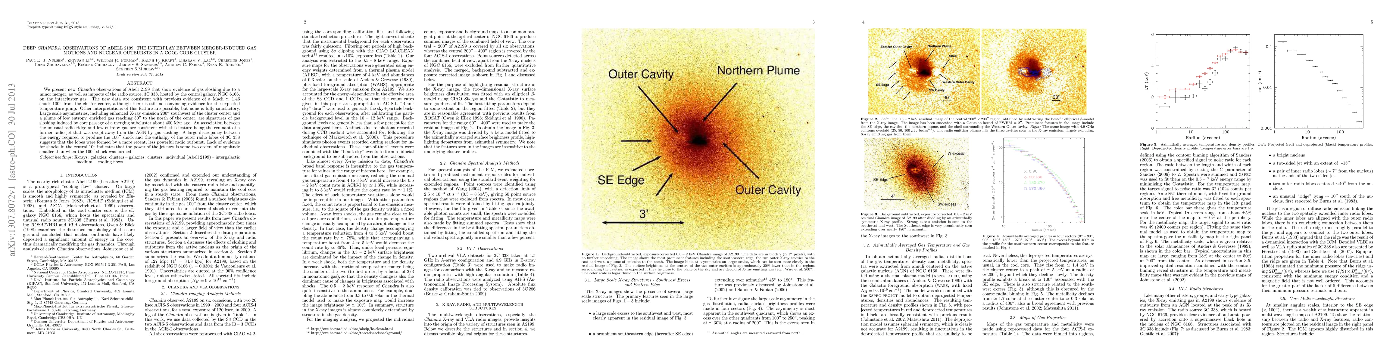 We present new Chandra observations of Abell 2199 that show evidence of gas sloshing due to a minor merger, as well as impacts of the radio source, 3C 338, hosted by the central galaxy, NGC 6166, on the intracluster gas. The new data are consistent with previous evidence of a Mach 1.46 shock 100" from the cluster center, although there is still no convincing evidence for the expected temperature jump. Other interpretations of this feature are possible, but none is fully satisfactory. Large scale asymmetries, including enhanced X-ray emission 200" southwest of the cluster center and a plume of low entropy, enriched gas reaching 50" to the north of the center, are signatures of gas sloshing induced by core passage of a merging subcluster about 400 Myr ago. An association between the unusual radio ridge and low entropy gas are consistent with this feature being the remnant of a former radio jet that was swept away from the AGN by gas sloshing. A large discrepancy between the energy required to produce the 100" shock and the enthalpy of the outer radio lobes of 3C 338 suggests that the lobes were formed by a more recent, less powerful radio outburst. Lack of evidence for shocks in the central 10" indicates that the power of the jet now is some two orders of magnitude smaller than when the 100" shock was formed.