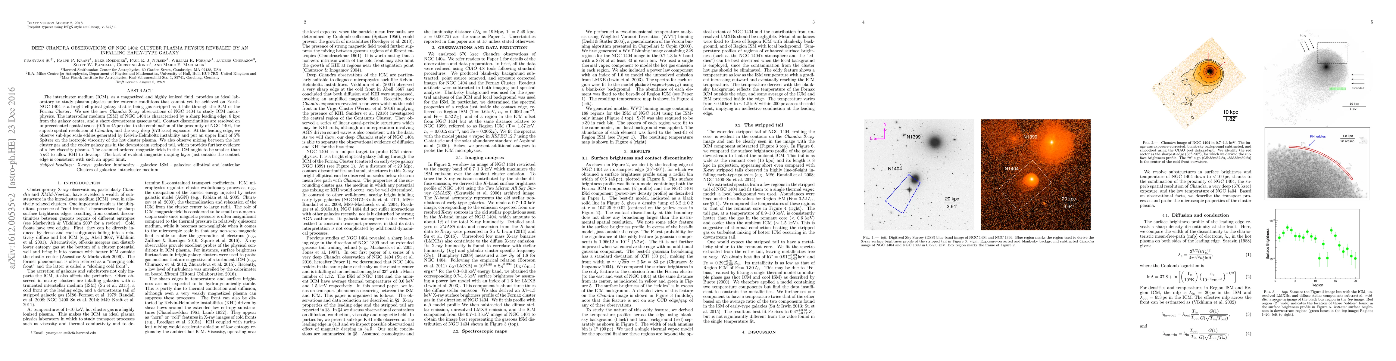 The intracluster medium (ICM), as a magnetized and highly ionized fluid, provides an ideal laboratory to study plasma physics under extreme conditions that cannot yet be achieved on Earth. NGC 1404 is a bright elliptical galaxy that is being gas stripped as it falls through the ICM of the Fornax Cluster. We use the new {\sl Chandra} X-ray observations of NGC 1404 to study ICM microphysics. The interstellar medium (ISM) of NGC 1404 is characterized by a sharp leading edge, 8 kpc from the galaxy center, and a short downstream gaseous tail. Contact discontinuities are resolved on unprecedented spatial scales ($0\farcs5=45$\,pc) due to the combination of the proximity of NGC 1404, the superb spatial resolution of {\sl Chandra}, and the very deep (670 ksec) exposure. At the leading edge, we observe sub-kpc scale eddies generated by Kelvin-Helmholtz instability and put an upper limit of 5\% Spitzer on the isotropic viscosity of the hot cluster plasma. We also observe mixing between the hot cluster gas and the cooler galaxy gas in the downstream stripped tail, which provides further evidence of a low viscosity plasma. The assumed ordered magnetic fields in the ICM ought to be smaller than 5\,$\mu$G to allow KHI to develop. The lack of evident magnetic draping layer just outside the contact edge is consistent with such an upper limit.