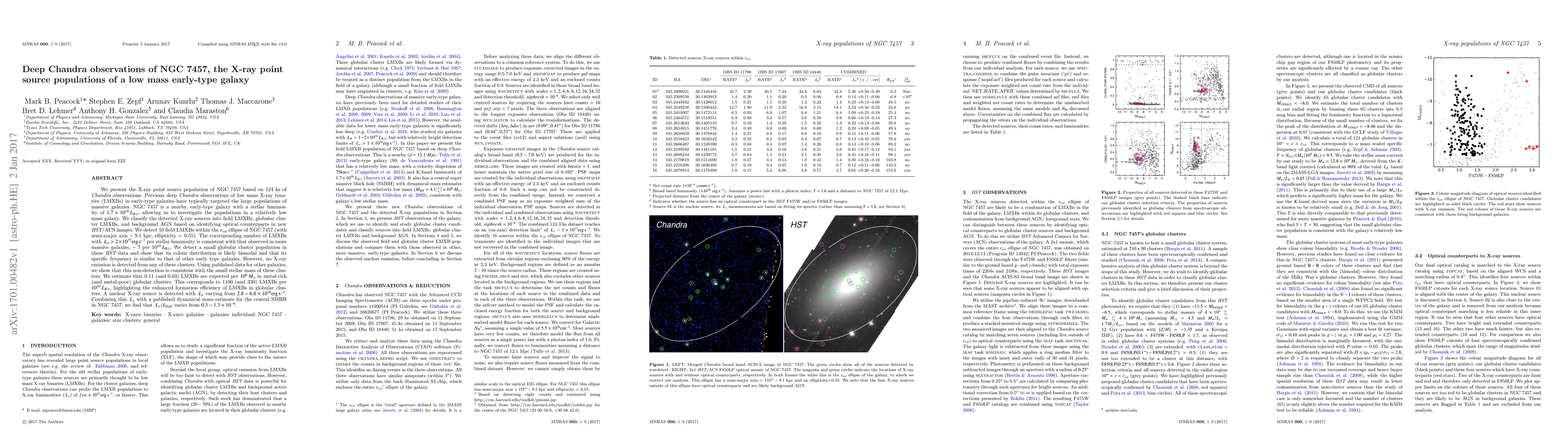 This study uses deep Chandra X-ray observations to analyze the low mass early-type galaxy NGC 7457, identifying 10 field low-mass X-ray binaries (LMXBs) and detecting a nuclear X-ray source, while finding no X-ray emission from globular clusters. The findings suggest similar LMXB densities in NGC 7457 compared to more massive galaxies.