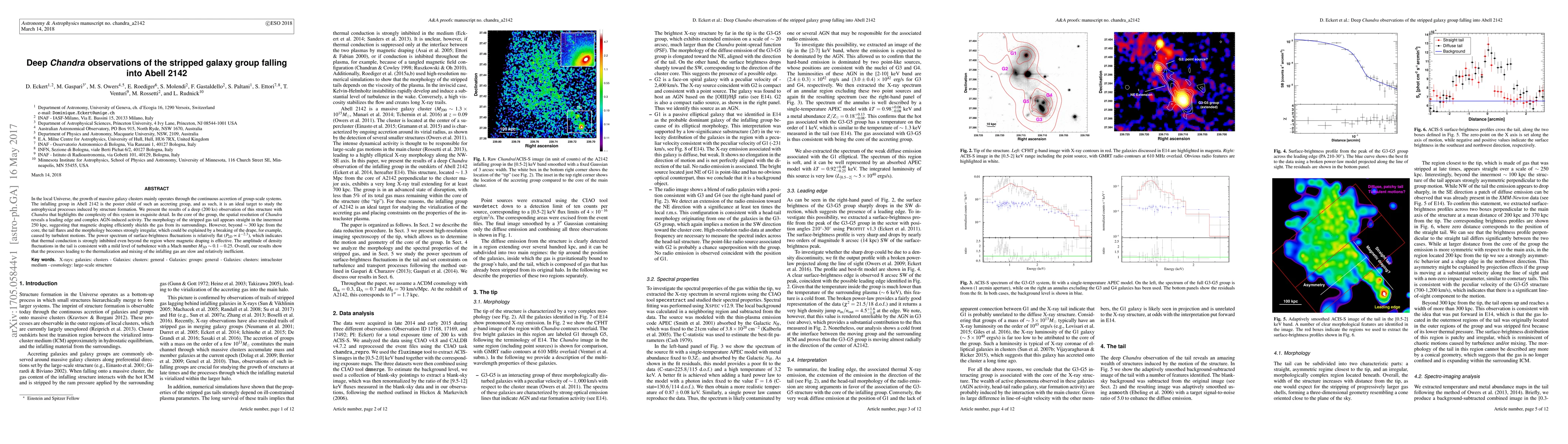 A deep Chandra observation reveals a stripped galaxy group falling into Abell 2142, showing complex astrophysical processes including magnetic draping, thermal conduction, and turbulence.