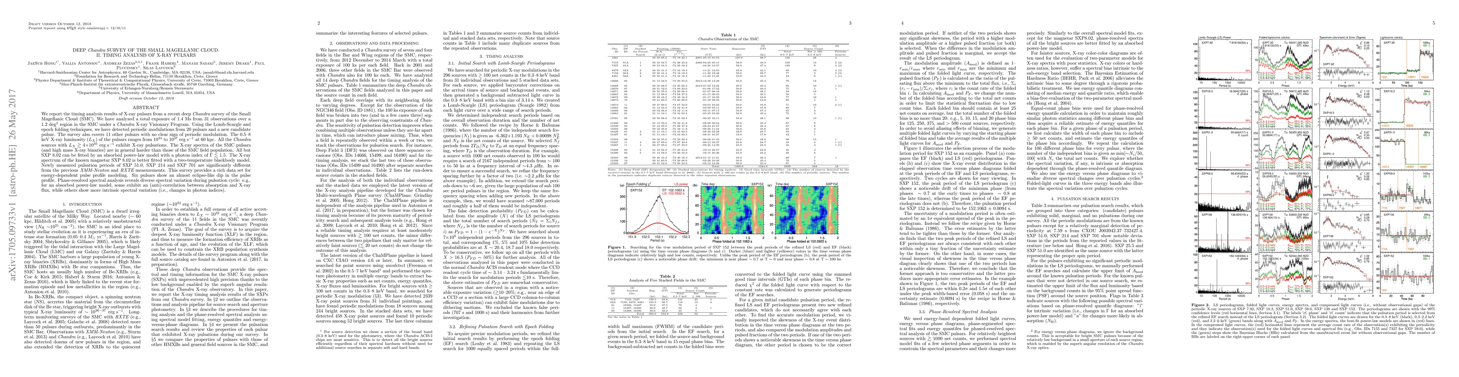 This paper reports the timing analysis of X-ray pulsars detected in a deep Chandra survey of the Small Magellanic Cloud, revealing periodic modulations in 20 pulsars and a new candidate pulsar, with X-ray luminosities ranging from $10^{34}$ to $10^{37}$ erg s$^{-1}$. The survey also identified diverse spectral variations and eclipse-like dips in the pulse profiles of some pulsars.