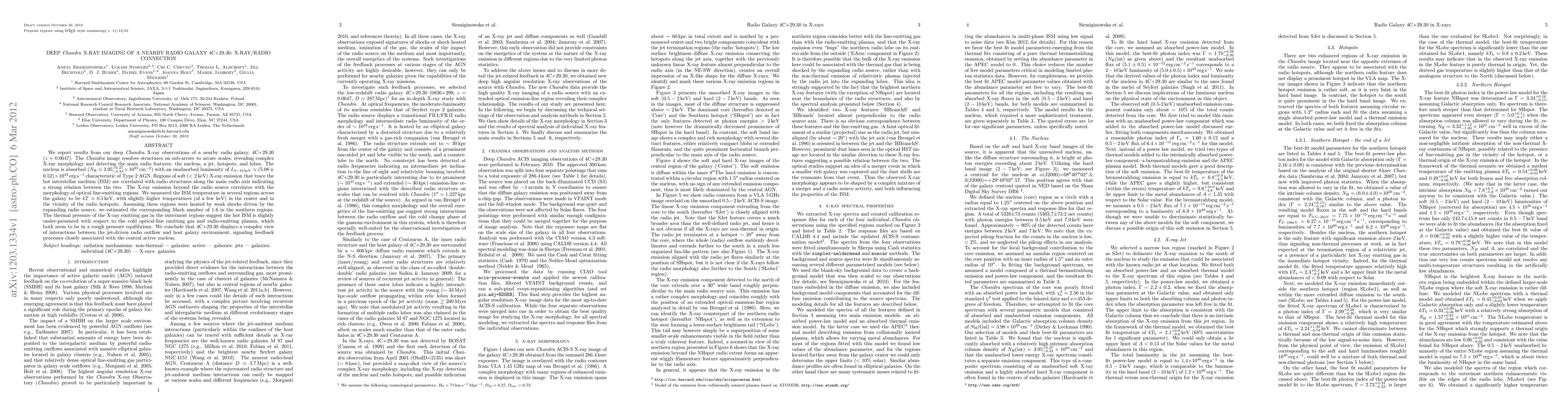 We report results from our deep Chandra X-ray observations of a nearby radio galaxy, 4C+29.30 (z=0.0647). The Chandra image resolves structures on sub-arcsec to arcsec scales, revealing complex X-ray morphology and detecting the main radio features: the nucleus, a jet, hotspots, and lobes. The nucleus is absorbed (N(H)=3.95 (+0.27/-0.33)x10^23 atoms/cm^2) with an unabsorbed luminosity of L(2-10 keV) ~ (5.08 +/-0.52) 10^43 erg/s characteristic of Type 2 AGN. Regions of soft (<2 keV) X-ray emission that trace the hot interstellar medium (ISM) are correlated with radio structures along the main radio axis indicating a strong relation between the two. The X-ray emission beyond the radio source correlates with the morphology of optical line-emitting regions. We measured the ISM temperature in several regions across the galaxy to be kT ~ 0.5 with slightly higher temperatures (of a few keV) in the center and in the vicinity of the radio hotspots. Assuming these regions were heated by weak shocks driven by the expanding radio source, we estimated the corresponding Mach number of 1.6 in the southern regions. The thermal pressure of the X-ray emitting gas in the outermost regions suggest the hot ISM is slightly under-pressured with respect to the cold optical-line emitting gas and radio-emitting plasma, which both seem to be in a rough pressure equilibrium. We conclude that 4C+29.30 displays a complex view of interactions between the jet-driven radio outflow and host galaxy environment, signaling feedback processes closely associated with the central active nucleus.