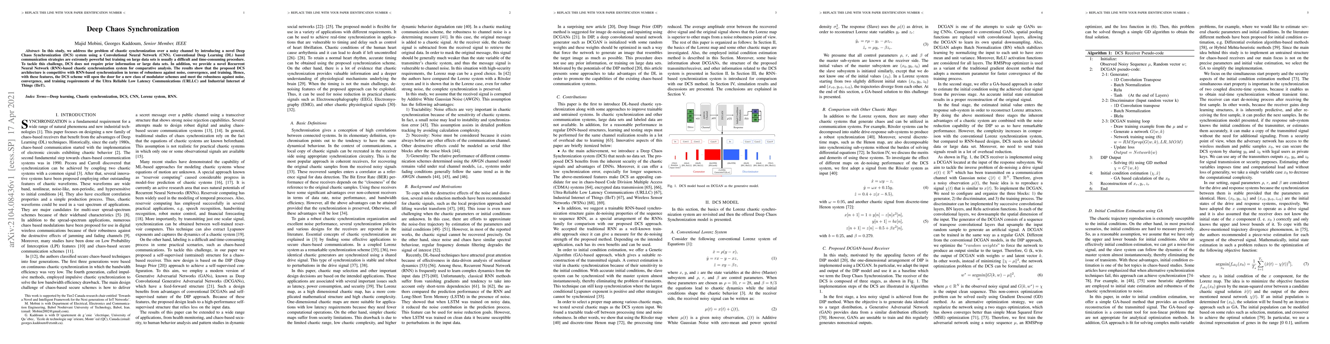 In this study, we address the problem of chaotic synchronization over a noisy channel by introducing a novel Deep Chaos Synchronization (DCS) system using a Convolutional Neural Network (CNN). Conventional Deep Learning (DL) based communication strategies are extremely powerful but training on large data sets is usually a difficult and time-consuming procedure. To tackle this challenge, DCS does not require prior information or large data sets. In addition, we provide a novel Recurrent Neural Network (RNN)-based chaotic synchronization system for comparative analysis. The results show that the proposed DCS architecture is competitive with RNN-based synchronization in terms of robustness against noise, convergence, and training. Hence, with these features, the DCS scheme will open the door for a new class of modulator schemes and meet the robustness against noise, convergence, and training requirements of the Ultra Reliable Low Latency Communications (URLLC) and Industrial Internet of Things (IIoT).