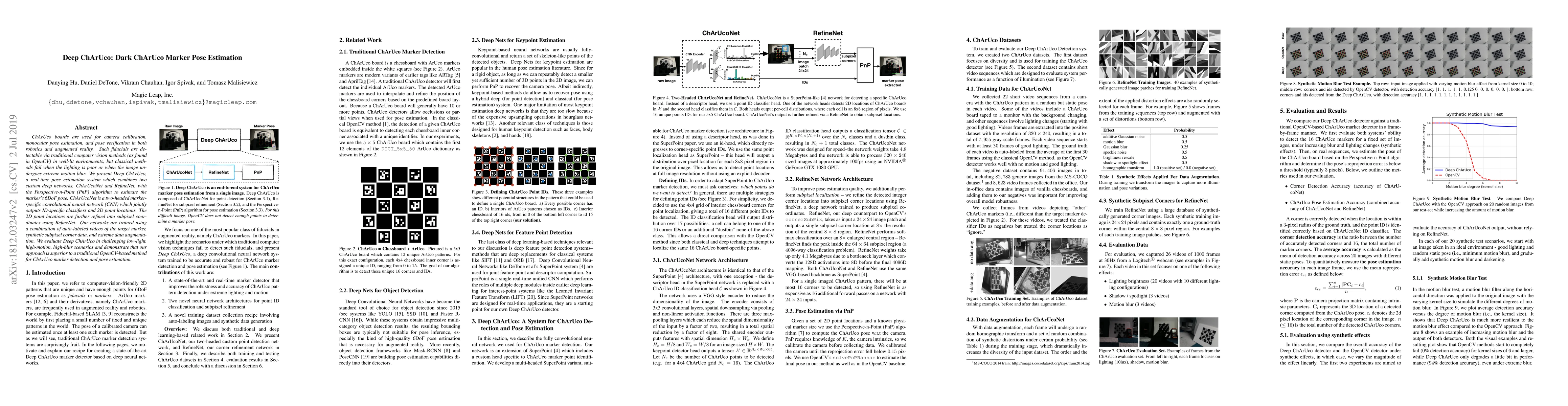Deep ChArUco combines custom deep networks with the PnP algorithm for real-time 6DoF pose estimation of ChArUco markers, outperforming traditional OpenCV methods in low-light, high-motion, and high-blur conditions. The system uses ChArUcoNet for marker detection and RefineNet for subpixel refinement.