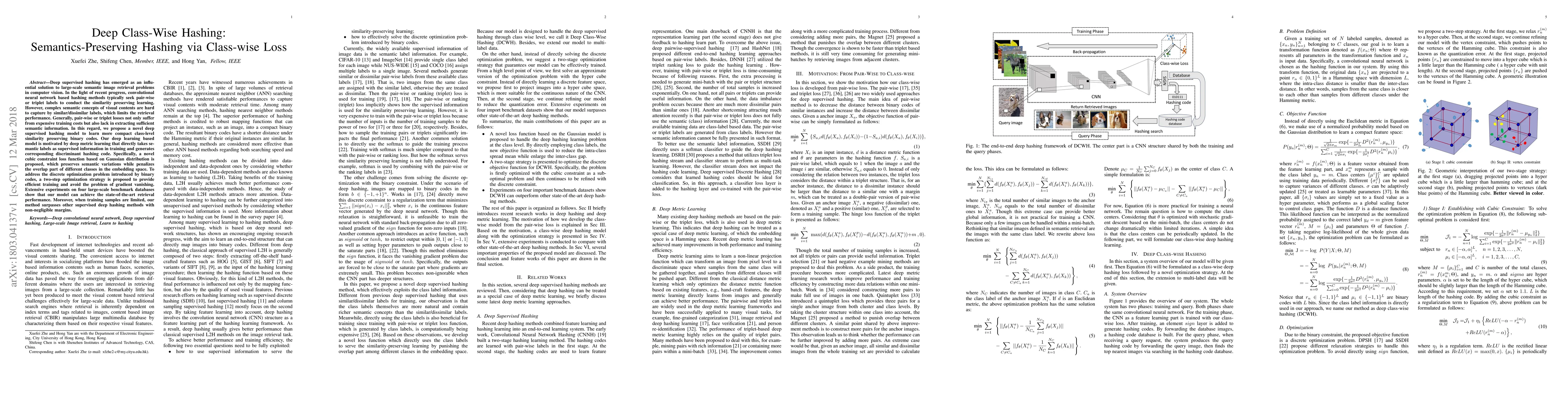 This paper proposes a novel deep supervised hashing method that utilizes class-level semantic labels to generate compact binary codes preserving class-wise similarities, addressing the limitations of pair-wise losses. The model employs a cubic constraint loss based on Gaussian distribution and a two-step optimization strategy to achieve efficient training and state-of-the-art retrieval performance, especially under limited training samples.